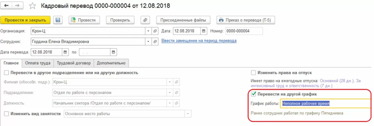 Рассмотрим на текущем примере следующую ситуацию: необходимо изменить отпуск, поскольку сотрудник досрочно приступает к выполнению своих трудовых обязанностей с сохранением размеров пособий.