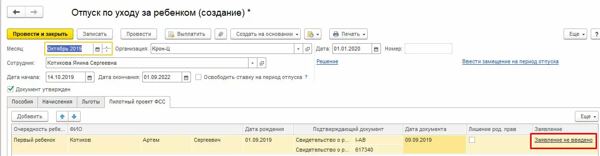 До полутора лет выплаты формируют через «Отпуск по уходу за ребенком». Если дата окончания пособия, превышает дату участия в проекте, появляется дополнительная вкладка «Пилотный проект ФСС». На вкладке прописываются данные ребенка