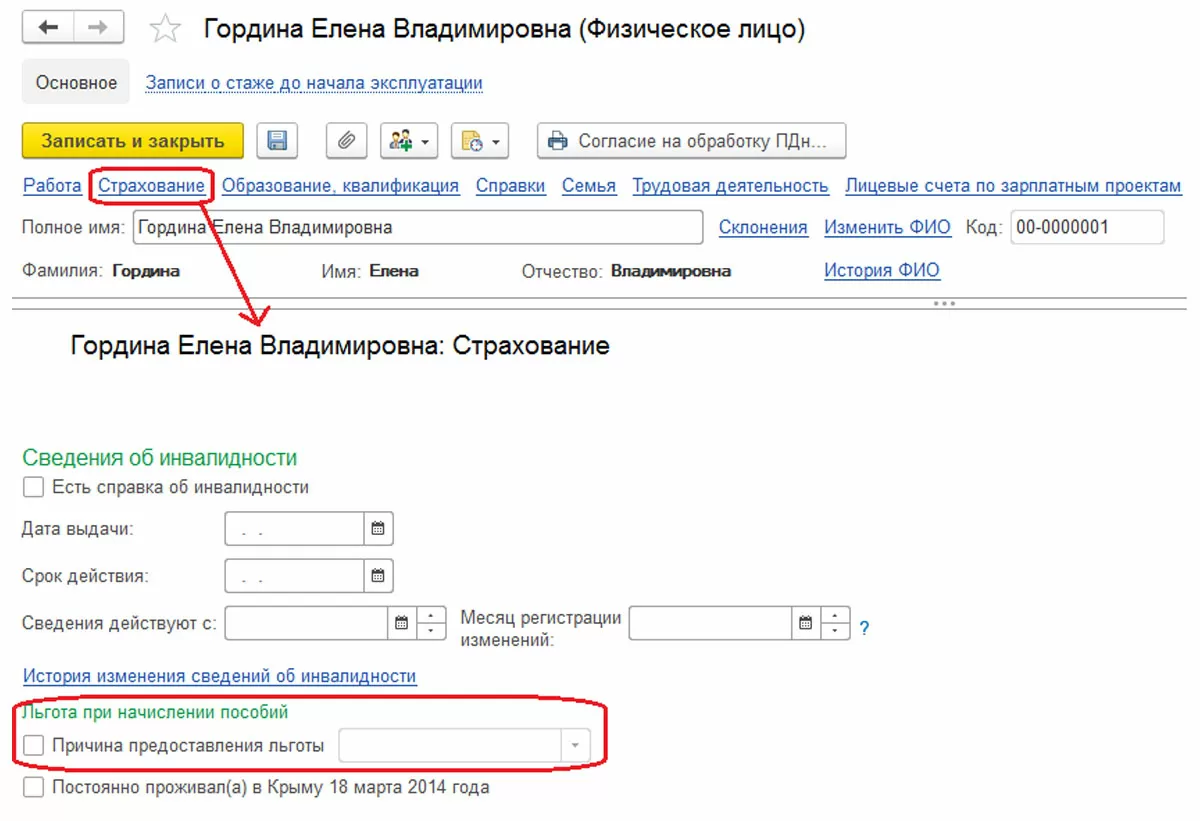 Для уплаты пособия в большем размере указываем причину увеличения в карточке физического лица, в блоке «Страхование».