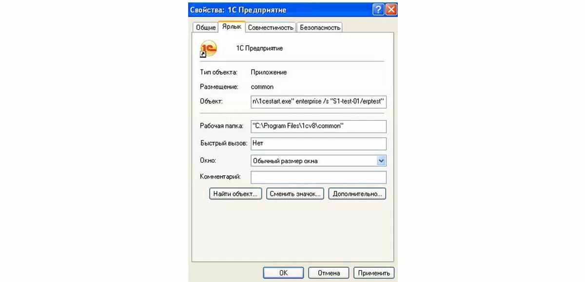 Перед тем как изучать конкретные параметры командной строки, необходимо понять, как ими пользоваться. Чаще всего используются два способа эксплуатации параметров для выполнения конкретных задач. В первом случае используется ярлык запуска программы 1С, вернее, его свойства. На вкладке «Ярлык» в поле «Объект» можно увидеть путь к размещению объекта – туда и необходимо дописать параметры.