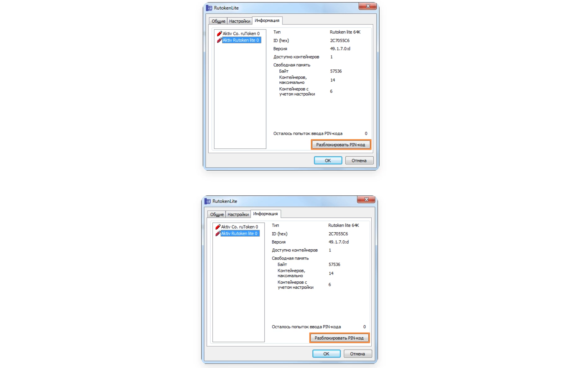 Через вкладку Оборудование нажать на кнопку Настроить типы носителей → Указать необходимый токен → Через окно Свойства провалиться в Информацию → разблокировать PIN.