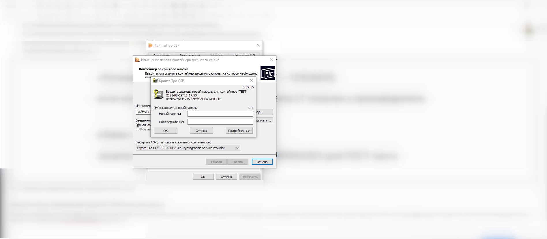 Во избежание компрометации ключа электронной подписи одним из способов защиты является пароль на закрытую часть ключа. Пароль устанавливается при генерации ключа или самостоятельно, если ключ является экспортируемым, через программу СКЗИ.