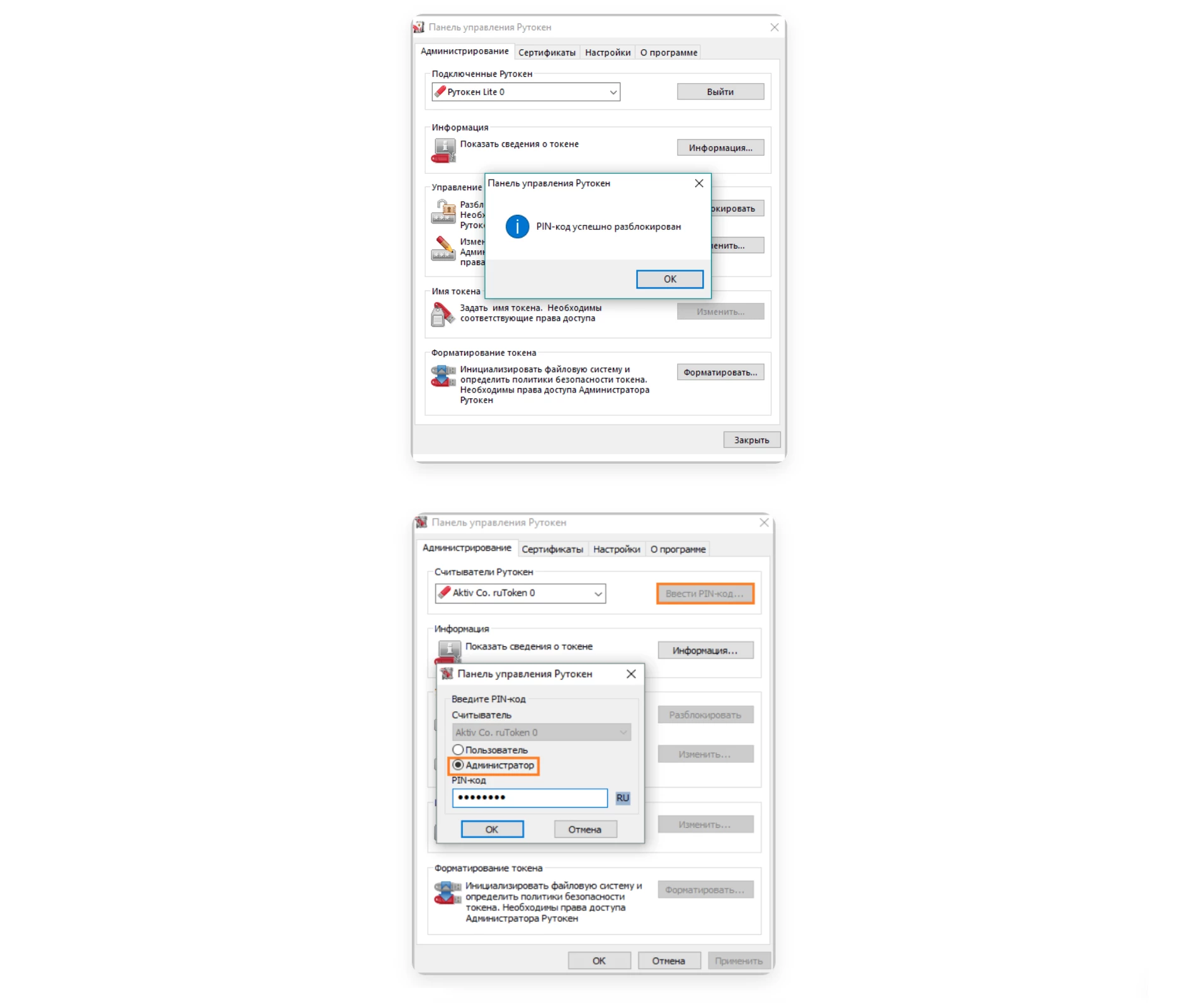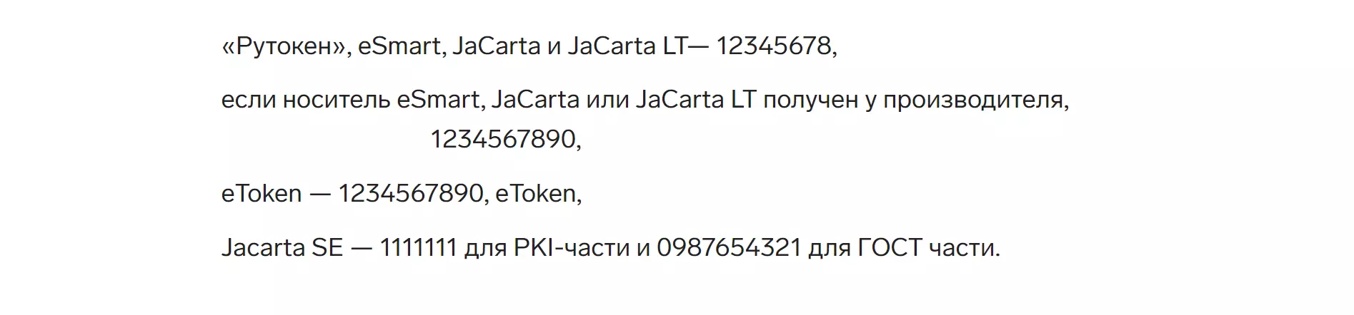 - Указать PIN-код администратора: для Рутокена — 87654321, для Jacarta SE — 00000000 для PKI-части и 1234567890 для ГОСТ части;