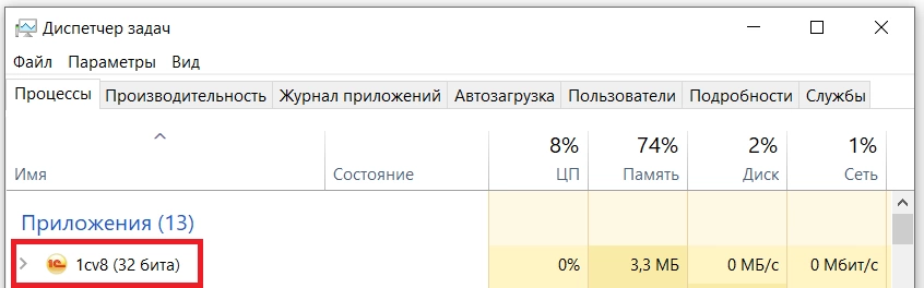 Наличие одновременно двух платформ 1С (32-х и 64-х разрядной) не скажется отрицательно на функциональности или работоспособности информационной базы, установленной на пользовательском компьютере. А чтобы понять разрядность запущенного в данный момент приложения 1С, необходимо воспользоваться диспетчером задач.