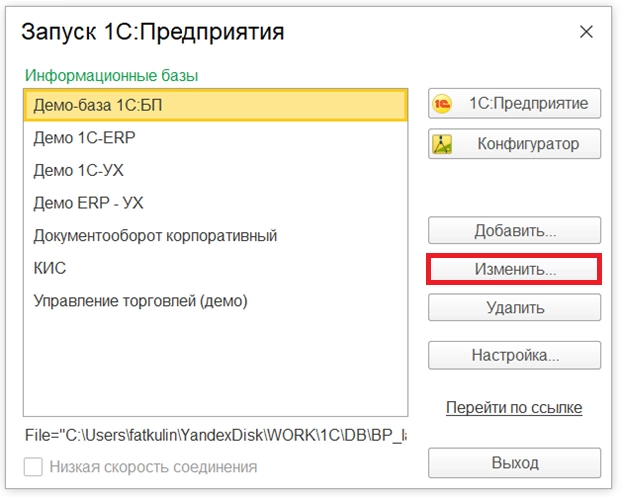 Самым простым способом решения данной проблемы является установка отдельной 32-х разрядной платформы, которая позволит пользоваться модулем печати двумерного штрих-кода. Для ее настройки необходимо выполнить редактирование настроек запуска информационной базы данных по кнопке «Изменить».