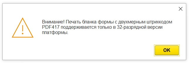 Если при использовании 64-х разрядной версии платформы требуется печатать двумерного кода PDF417, то при использовании модуля печати двумерного штрих-кода от издателя «ФГУП ГНИВЦ ФСН РФ в ПФО» у пользователя появится сообщение об ошибке.