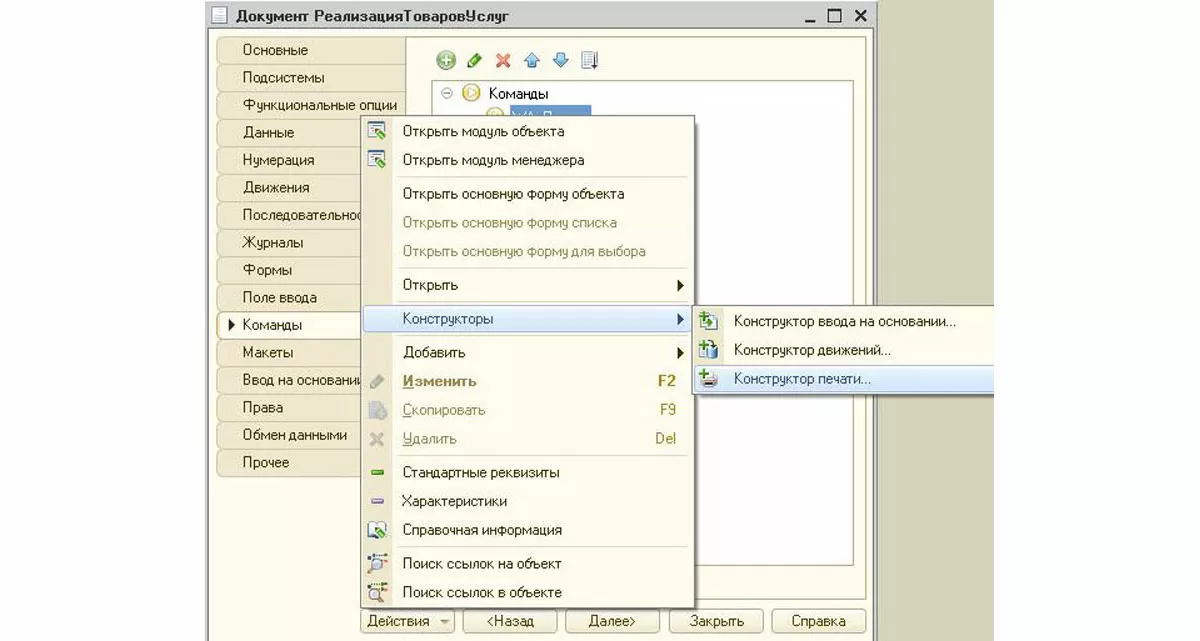 Для настройки новой печатной формы откройте конфигуратор базы и найдите нужный документ в дереве. Открыв его, нажмите кнопку «Действия» - «Конструкторы» - «Конструктор печати…». Платформа предложит выбрать для изменения существующую команду или создать новую, указав имя, после чего нажмите «Далее». При выборе наименования не используйте пробелы, так как будет сформирована одноименная процедура, а в их наименовании не допускаются пробелы.
