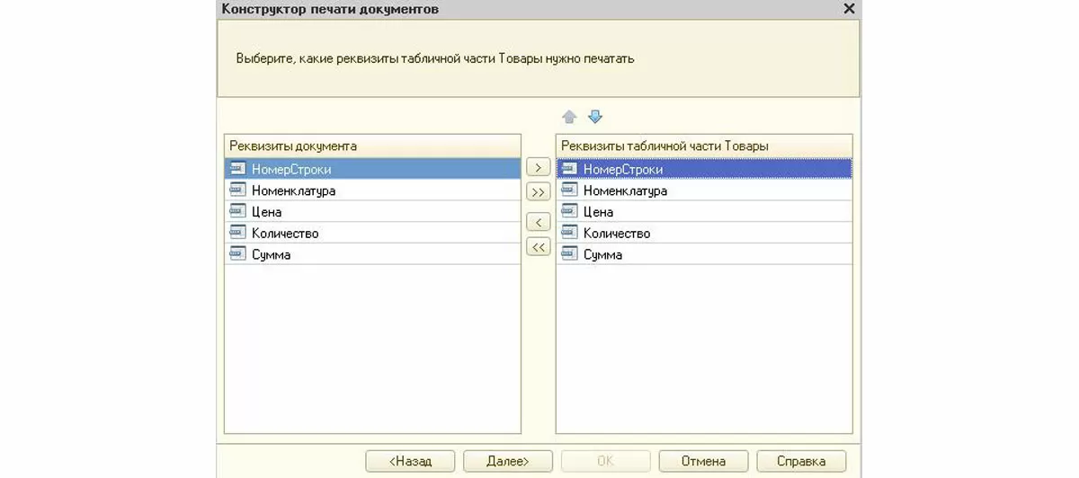 Поэтому в дальнейшем диалоге конструктор предложит выбрать, какие поля будут отражены в каждом разделе. Решается это простым перемещением из левого поля в правое. С помощью синих стрелок вы можете изменить порядок этих полей в результирующем макете. В конце вы можете включить дополнительные функции и выбрать, где будет размещаться кнопка запуска печатной формы.