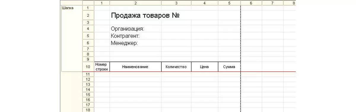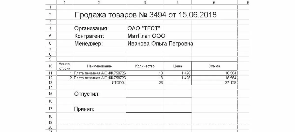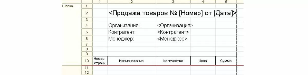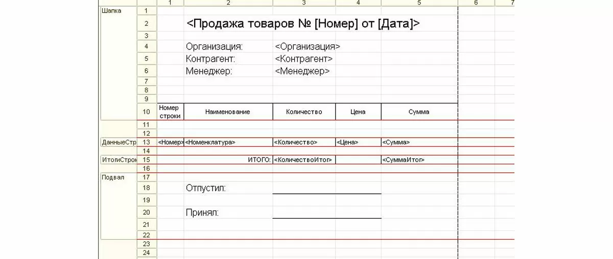 В качестве примера разберем печатную форму для документа продажи товаров. В нем перечислены номенклатура, организация, подразделение, менеджер и контрагент, кому продаются товары. Для информативной печатной формы необходимо выделить следующие области: