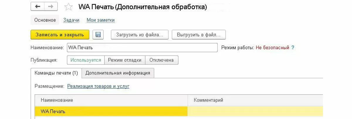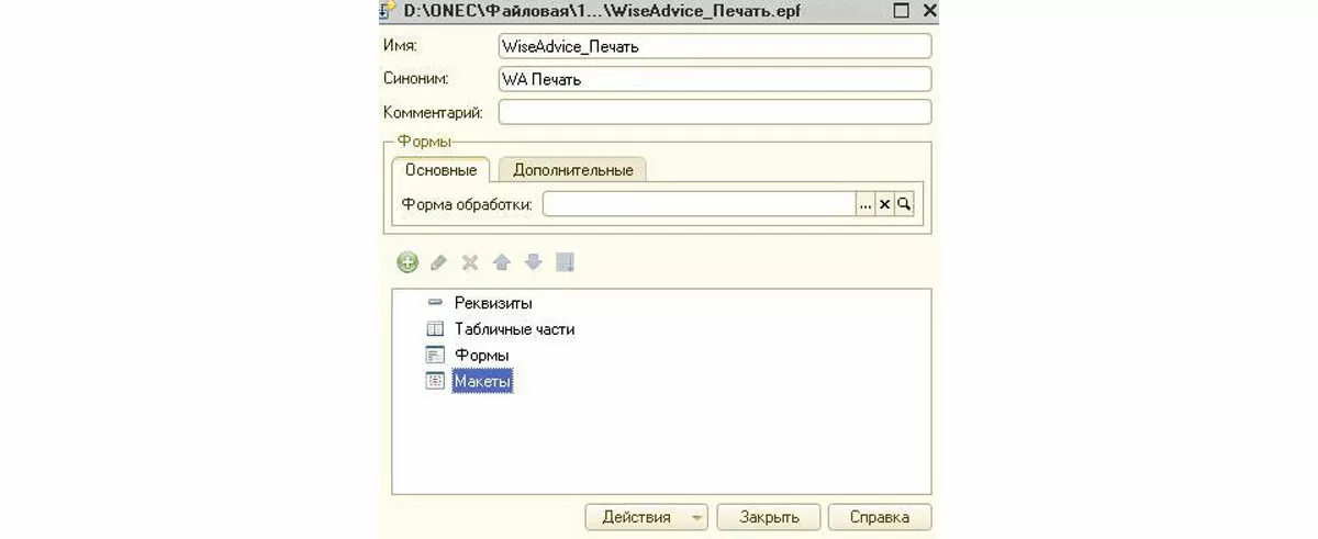 После завершения сохраняем внешнюю обработку и запускаем 1С в режиме предприятия. Чтобы подключить созданную печатную форму, зайдите в раздел «Администрирование» - «Печатные формы, отчеты и обработки» - «Дополнительные отчеты и обработки». Нажмите кнопку «Создать» и в диалоге выберите сохраненный файл формата *.EPF. Если все было сделано правильно, останется лишь сохранить, и 1С самостоятельно разместит новую печатную форму.