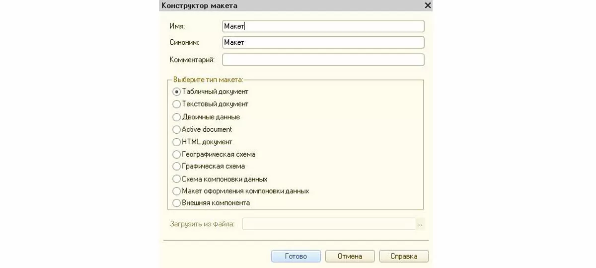 Затем необходимо добавить макет – структуру распечатываемой формы с перечнем переменных, куда и будут вставляться данные из конкретного документа 1С. В открывшемся конструкторе не стоит ничего менять и после подтверждения готовности откроется окно, похожее на Excel. В нем необходимо будет нарисовать форму и разделить ее на области с отдельными именами. Разделять стоит в зависимости от момента вывода на экран и того, сколько раз эта область должна появиться на экране.