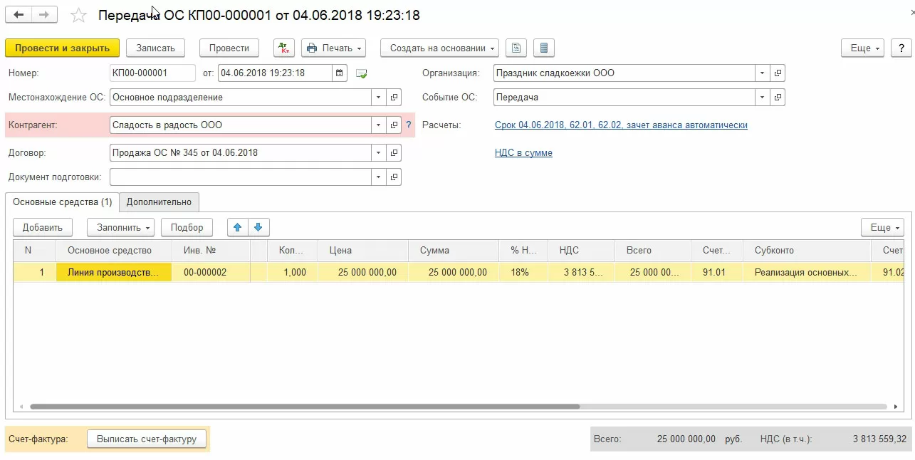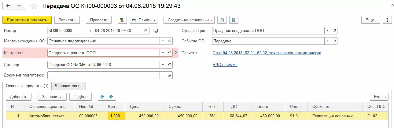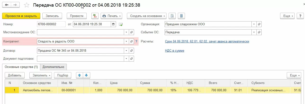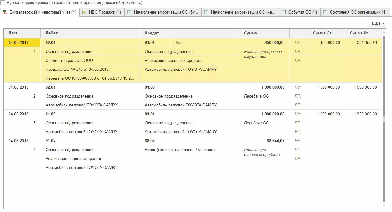 Видим, что в проводках отражается не только доход по счету 91.01, но и в качестве расхода на 91.02 списана остаточная стоимость ОС со счета 01.09 и зафиксирован НДС.