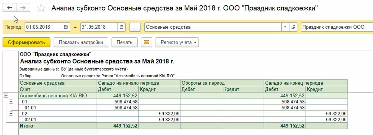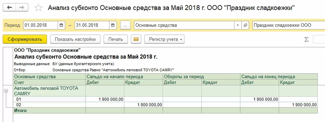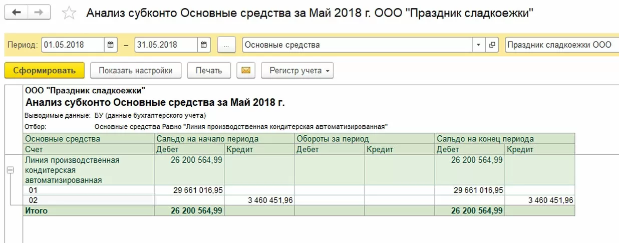 С помощью типового стандартного отчета «Анализ субконто» получаем информацию о состоянии объекта ОС, чтобы убедиться, что объект имеет ненулевую остаточную стоимость:
