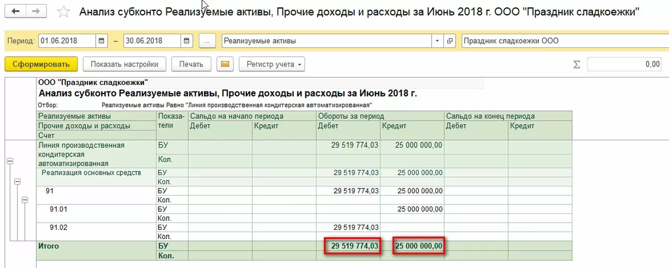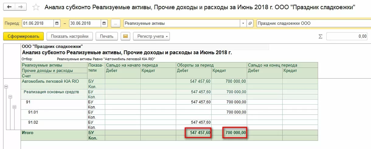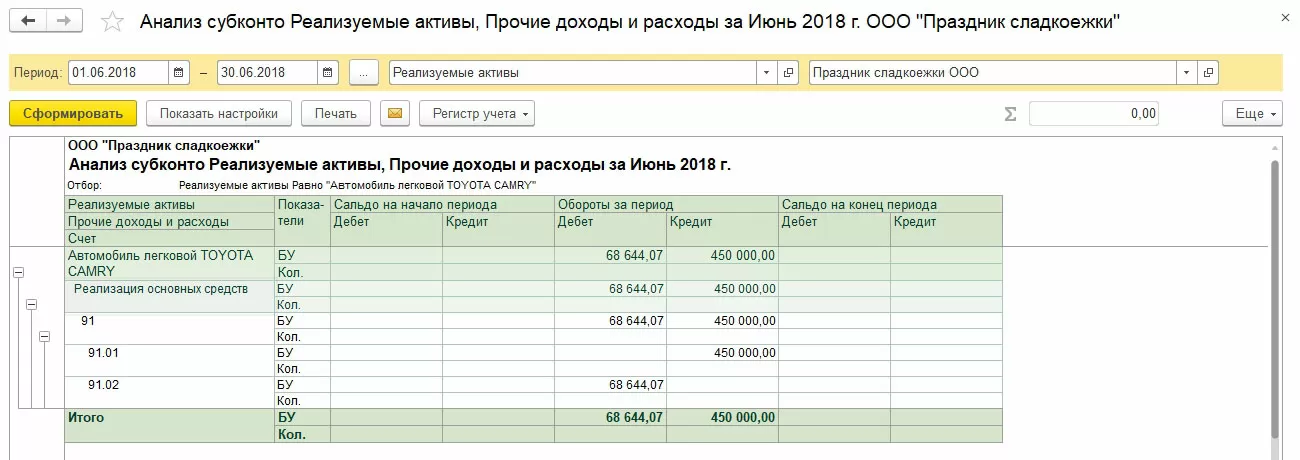 Финансовый результат от продажи данного ОС можно проанализировать стандартным отчетом «Анализ субконто» по аналитике «Реализуемые активы», которая используется на счете 91: