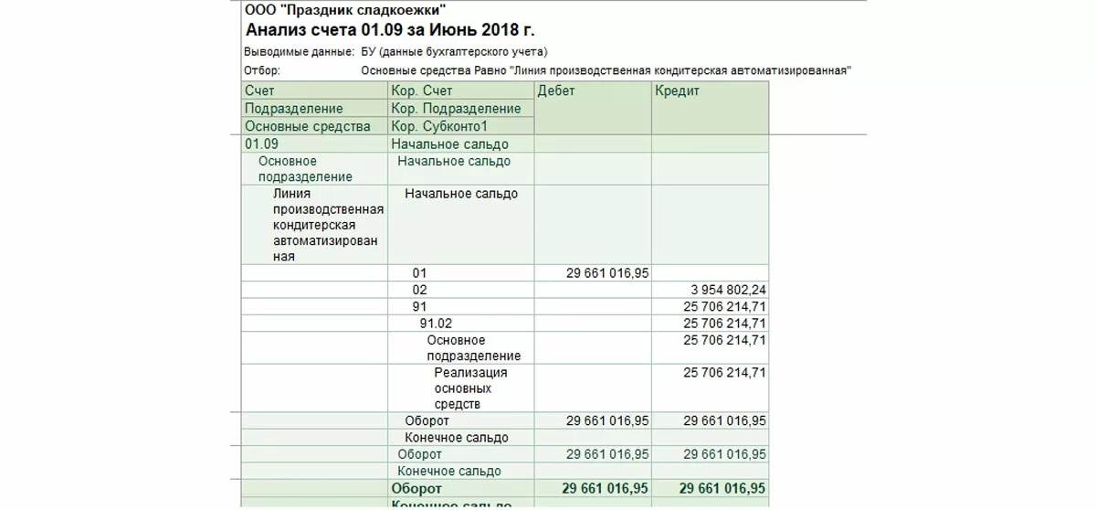 Проводим документ. Полученные проводки аналогичны второму варианту. Можно проанализировать результат еще одним типовым стандартным отчетом «Анализ счета» по счету 01.09, т.к. именно этот счет фиксирует результат по выбытию ОС.