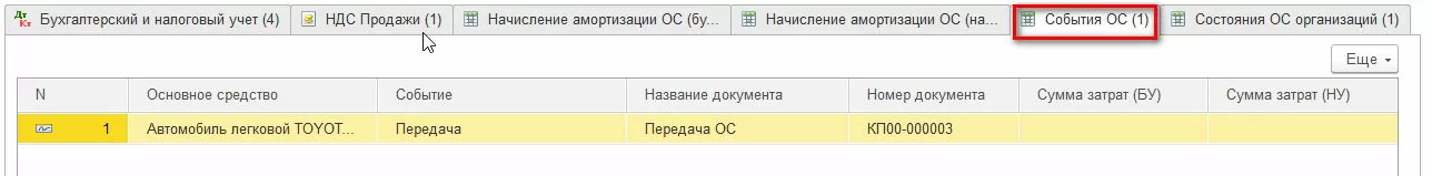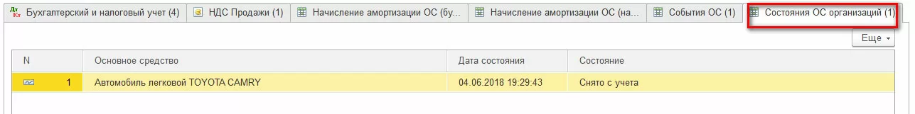 Выбытие ОС также сопровождается движениями по регистрам «Событие ОС» и «Состояния ОС организаций».