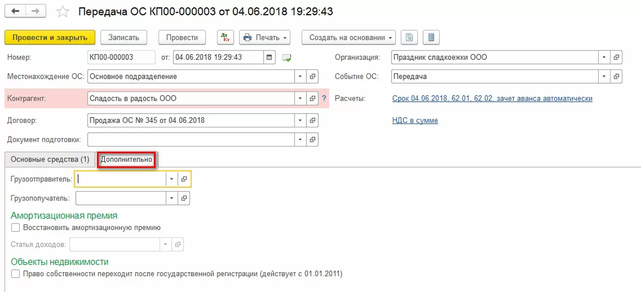 Закладка «Дополнительно» содержит настройки для корректной печати документа и учета амортизационной премии и объекта недвижимости.