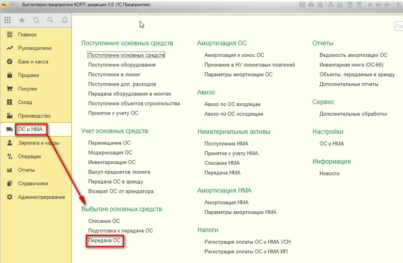 Передача основных средств относится к разделу операций по выбытию объектов, а документы для таких операций располагаются в соответствующем интерфейсе конфигурации: