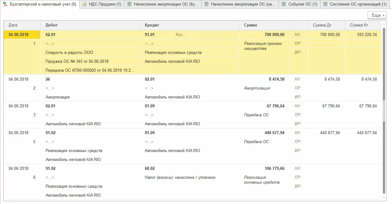 Видим, что прибыль от реализации получена, но не в том объеме, как от ОС с нулевой остаточной стоимостью.