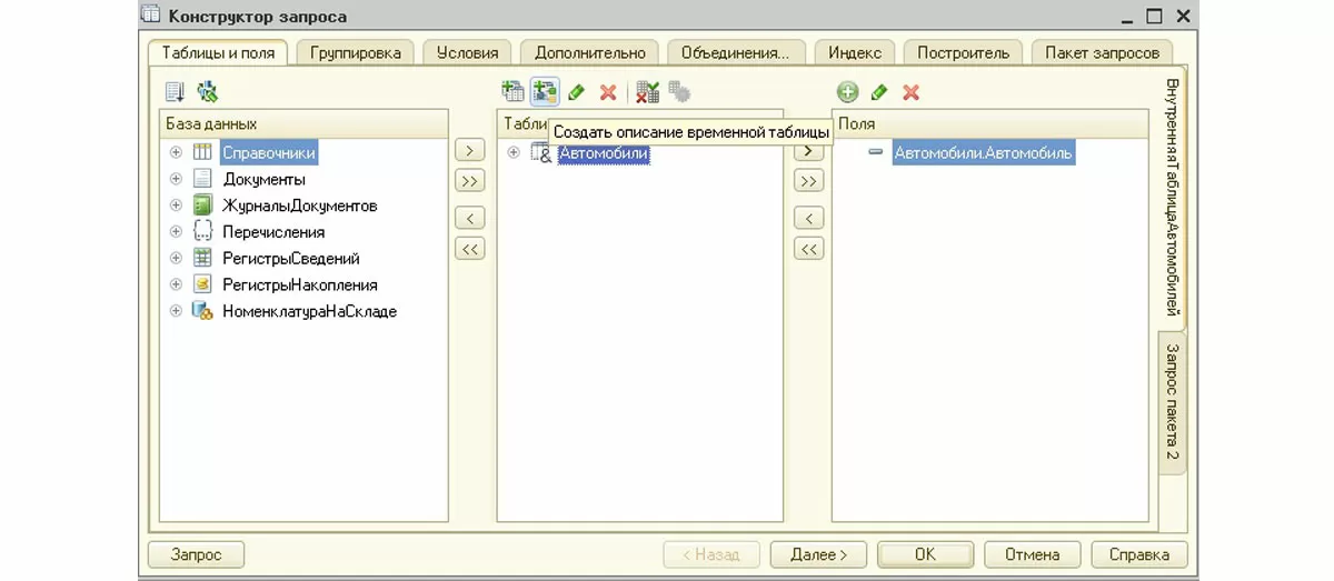 Чтобы в запросе получилась временная таблица, открыв конструктор запросов, необходимо нажать на специальную кнопку в среднем окне. Нам нужно правильно назвать таблицу и не ошибиться в написании наименования полей. Затем помещаем результат запроса во временную таблицу и во втором запросе из пакета соединяем данные. Этим простым запросом мы добавили таблицу в запрос 1С, состоящую из 1 колонки.