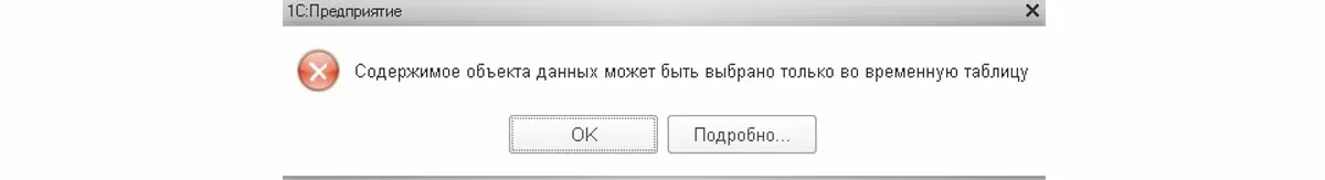 Чтобы поместить описанную таблицу в запрос, придется загрузить ее сначала во временную таблицу, а уже потом соединять с нужными данными. Это правило работы платформы, и если проигнорировать его, то при работе кода 1С выдаст ошибку. Если система сообщает, что данные могут быть выбраны исключительно во временную таблицу, то проверяйте, помещаете ли вы ТЗ в нее.