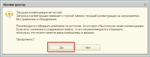 Система попросит выбрать файл для загрузки. Вот тут пригодится тот самый «CF», выгруженный из конфигуратора ЗУП КОРП. Его нужно выбрать, после чего система задаст вопрос – стоит ли вообще все это затевать?