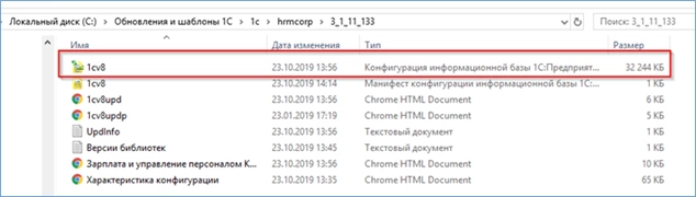 Перейдем в папку с шаблоном (путь к ней строится по принципу \1c\HRMCORP\<Номер_версии_конфигурации>). Здесь имеется файл с расширением «CF» (тип файла в проводнике «Конфигурация информационной базы»).
