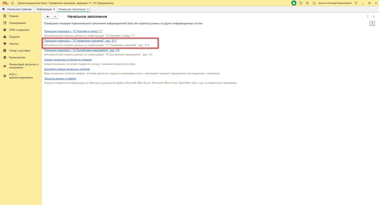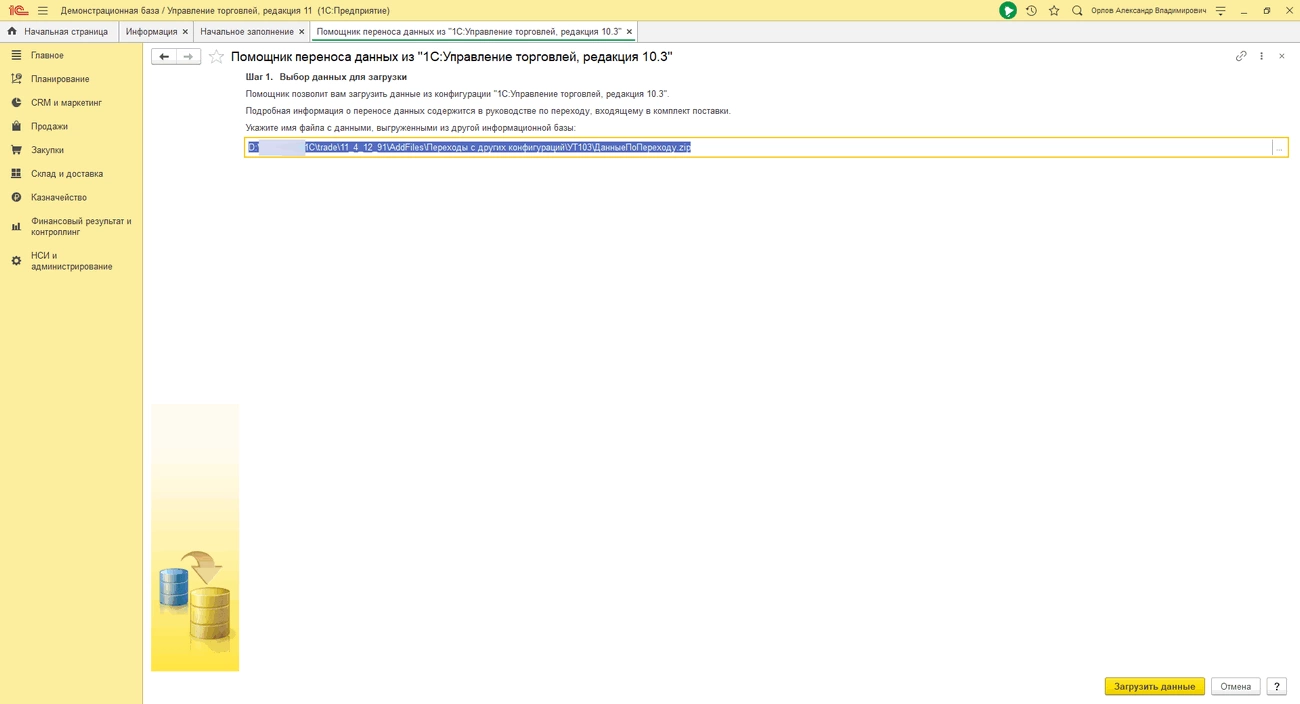 Перенос данных выполняется через встроенную функцию в УТ 11( меню «НСИ и Администрирование-Начальное заполнение» и меню Обработки «Помощник Перехода С Других Конфигураций», где соответственно нужно выбрать «Переход с УТ 10.3»). Далее следовать инструкции помощника по переносу данных и дождаться процесса завершения загрузки данных.