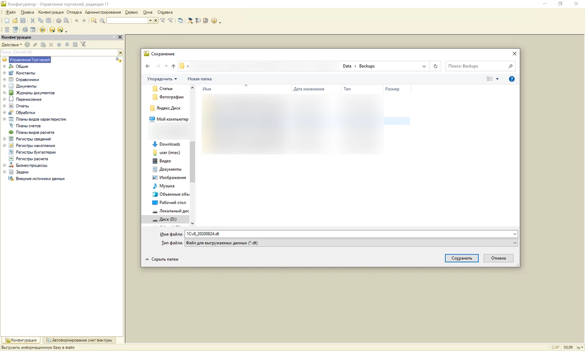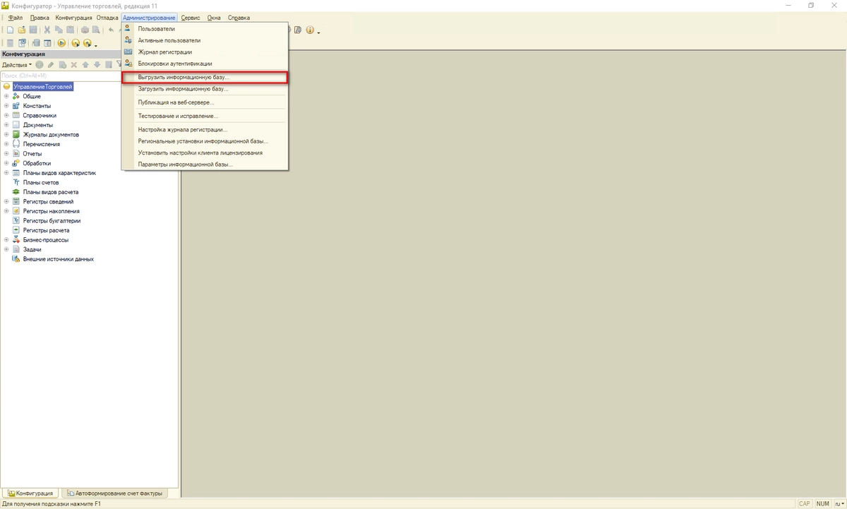 …а второй – выгрузить информационную базу через конфигуратор (меню «Администрирование» -> «Выгрузить ИБ»).