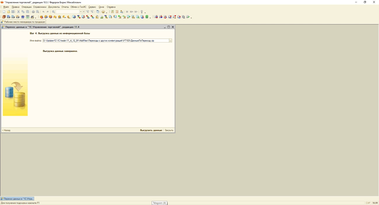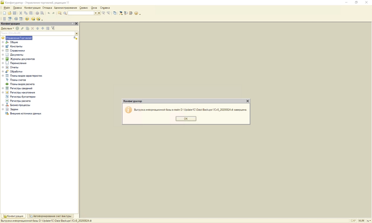 Процесс выгрузки может занять от нескольких минут до часа, следует дождаться окна-оповещения об окончании выгрузки базы.