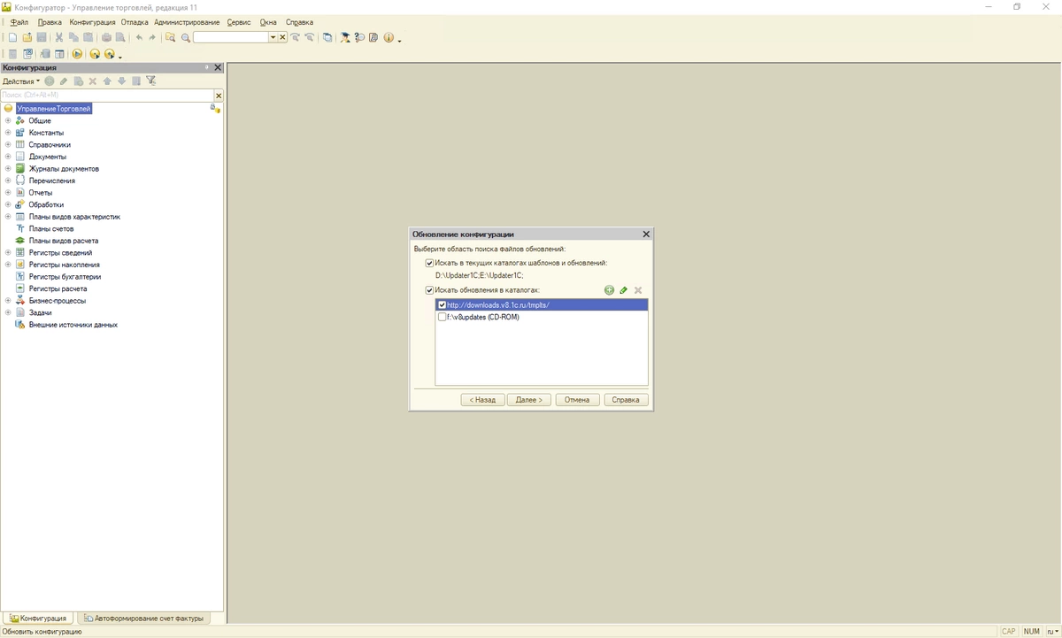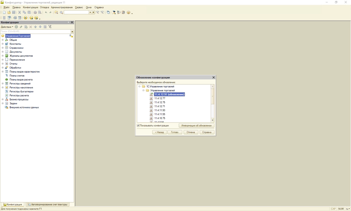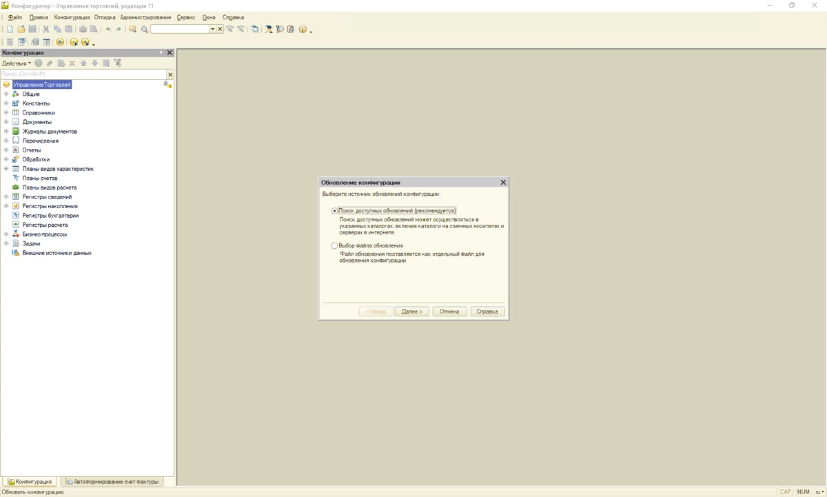 - В диалоговом окне «Обновление конфигурации» указать пункт «Доступные обновления», затем выбрать нужное обновление в соответствующем списке;