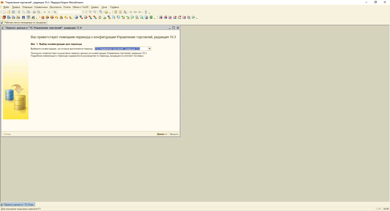 В каталоге установки конфигурации новой редакции находится готовая Обработка «Помощник по переходу на новую редакцию УТ 11.4», которую необходимо запустить в 1С:Управление торговлей редакции 10.3. Обработка откроет форму Помощника по переходу, в которой нужно следовать инструкциям по переносу данных.