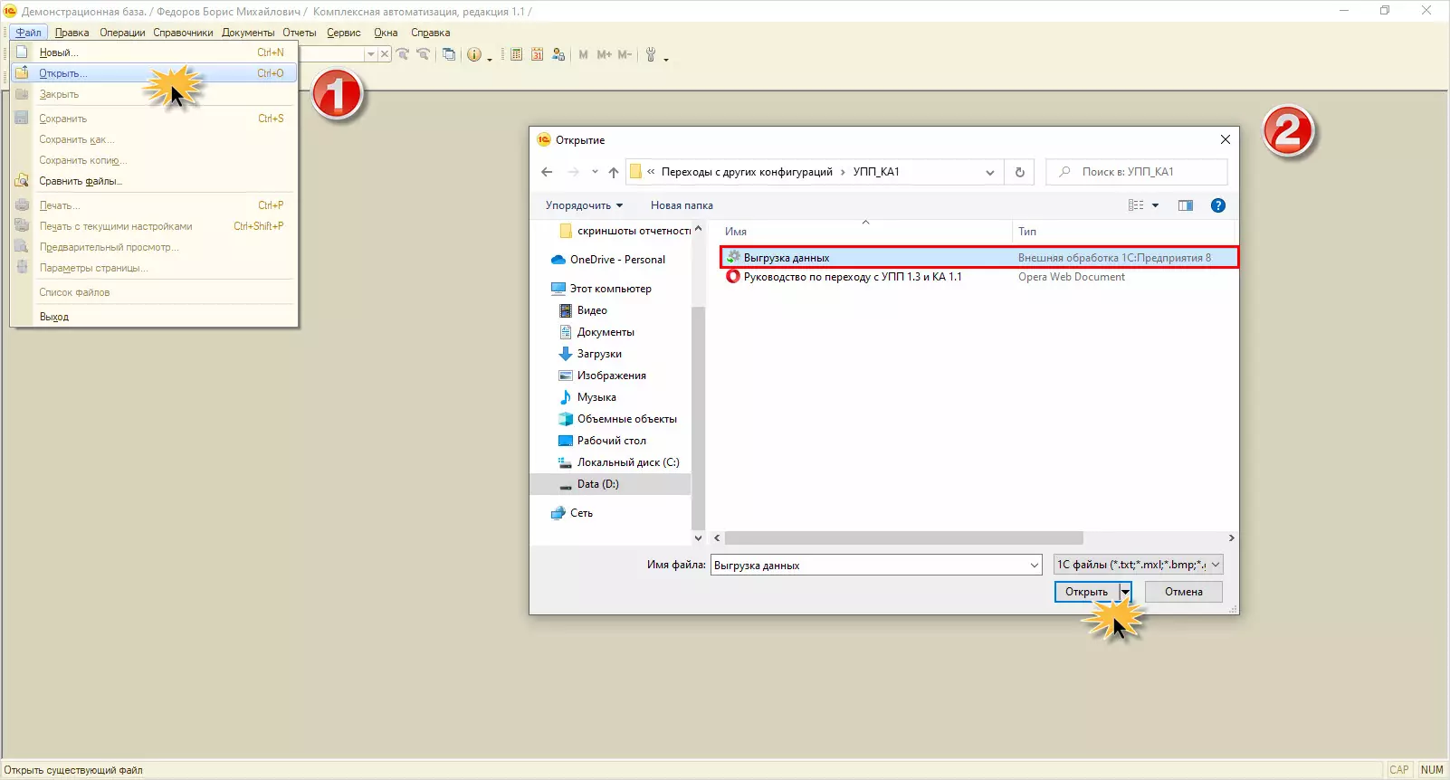 Шаг 1. Откройте файл внешней обработки «Выгрузка данных» в базе источнике – конфигурация 1С:КА 1.1 – меню Файл – Открыть.