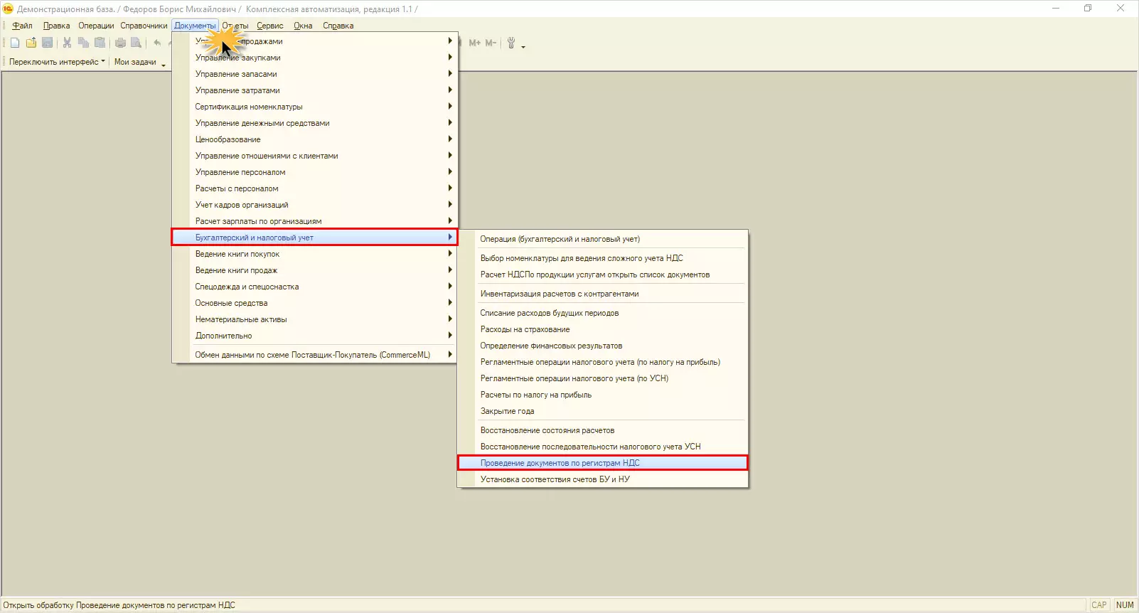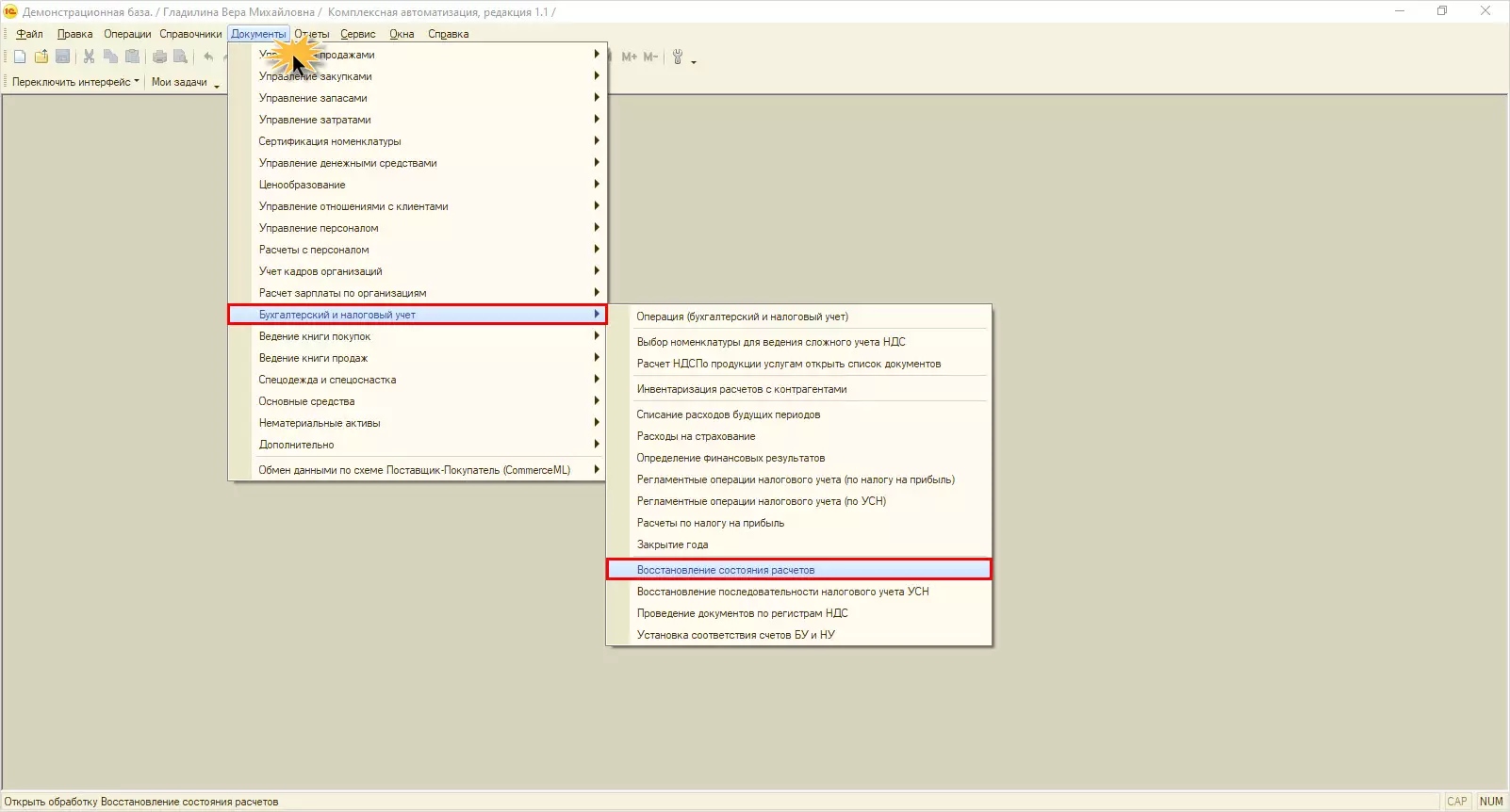 Шаг 5. Перейдите в Документы – Бухгалтерский и налоговый учет – Восстановление состояния расчетов.