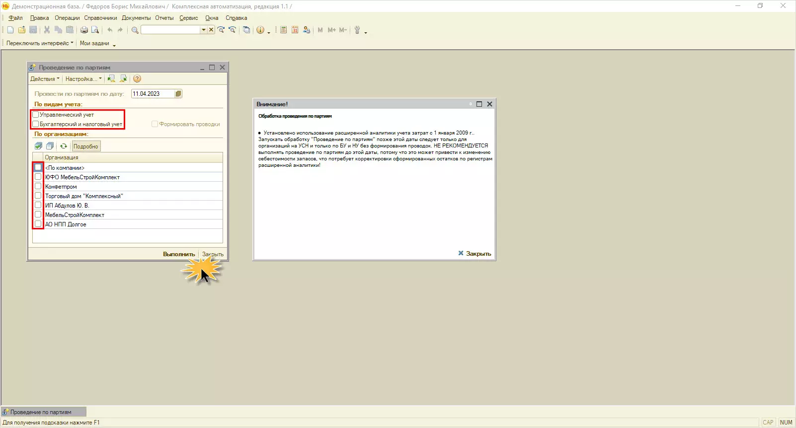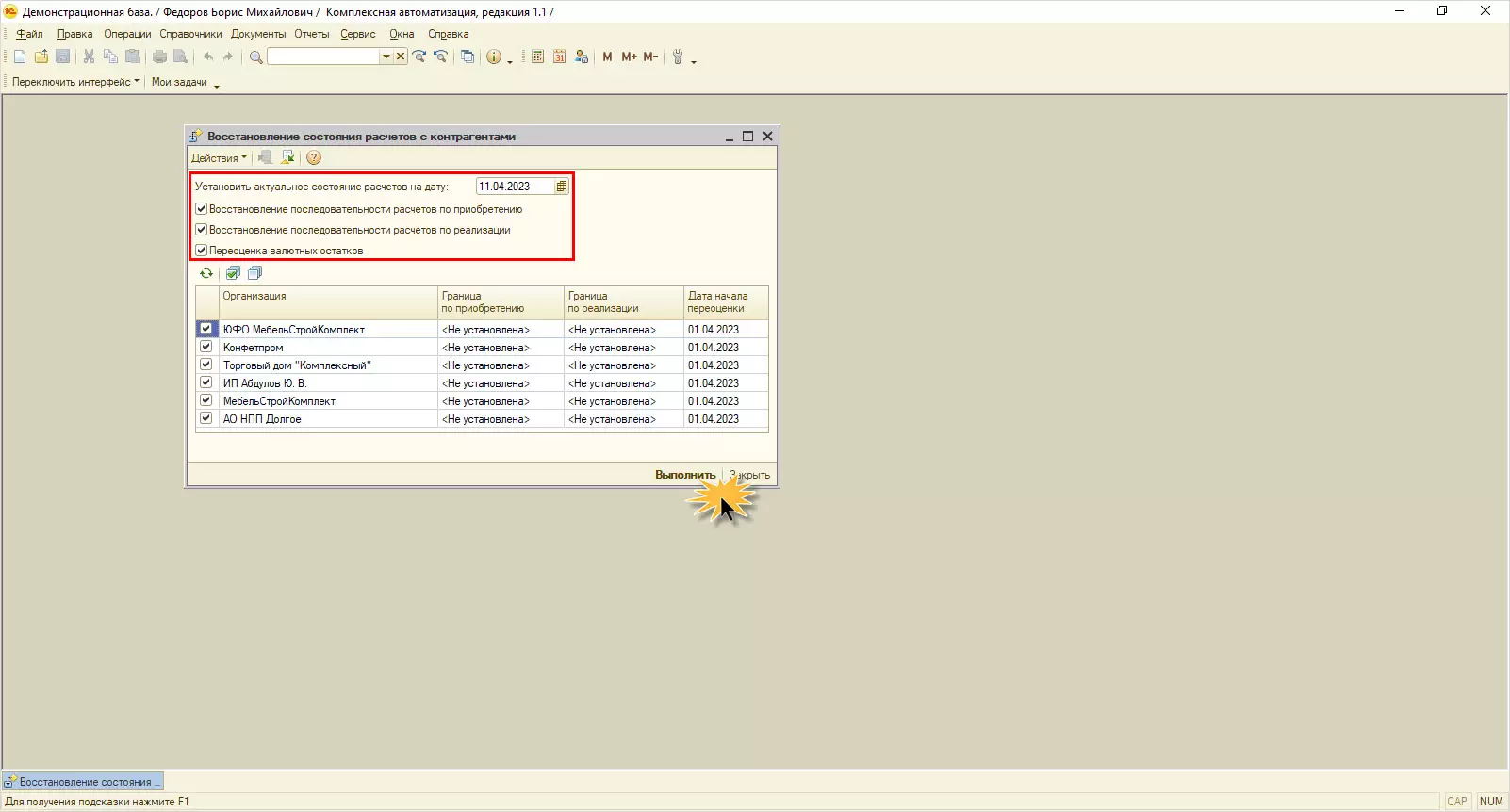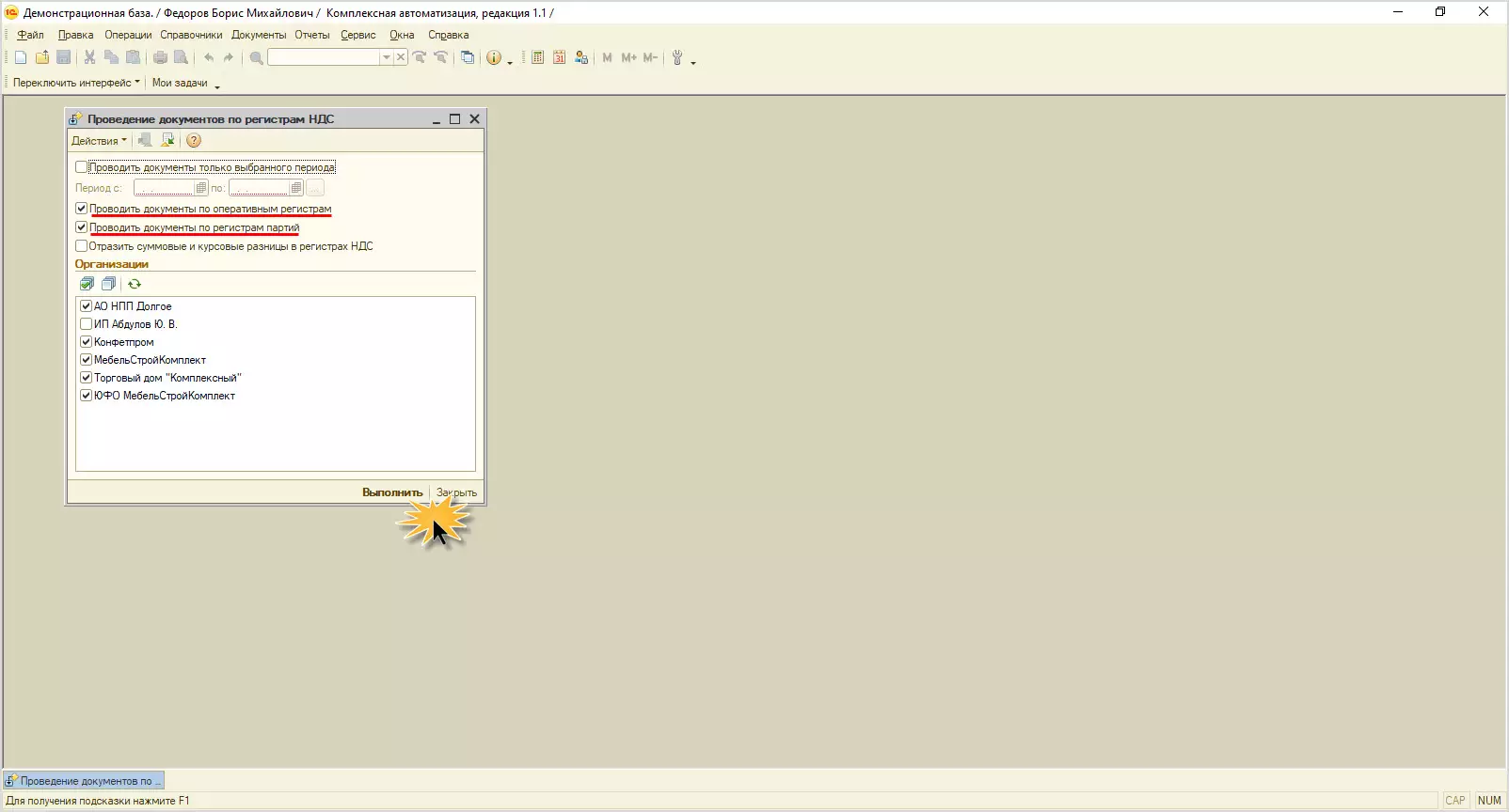 Отметьте галочками операции и организации, нажмите «Выполнить».