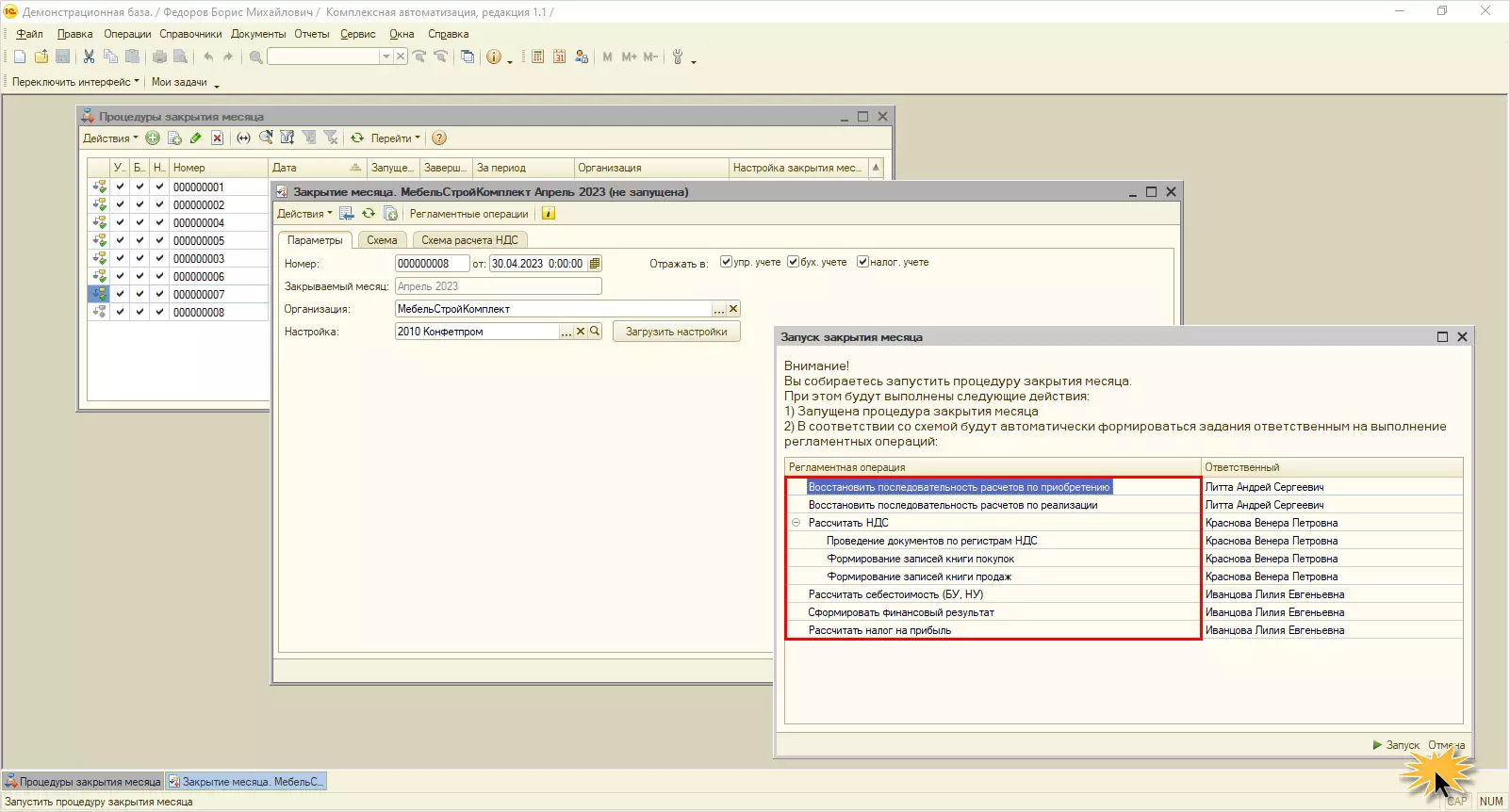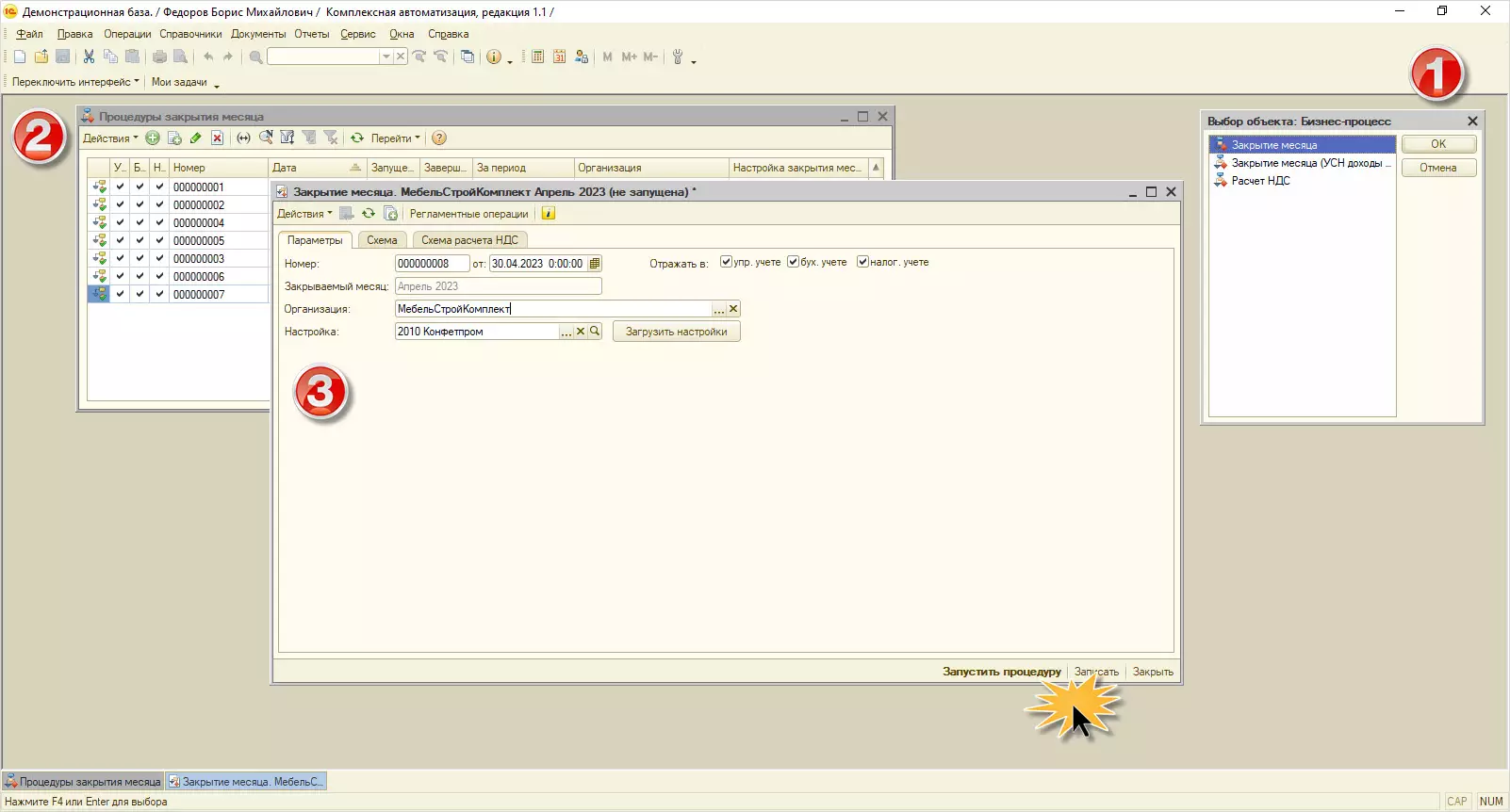 Выберите пункт «Закрытие месяца» и, нажав «Добавить», запустите процедуру для каждой организации.