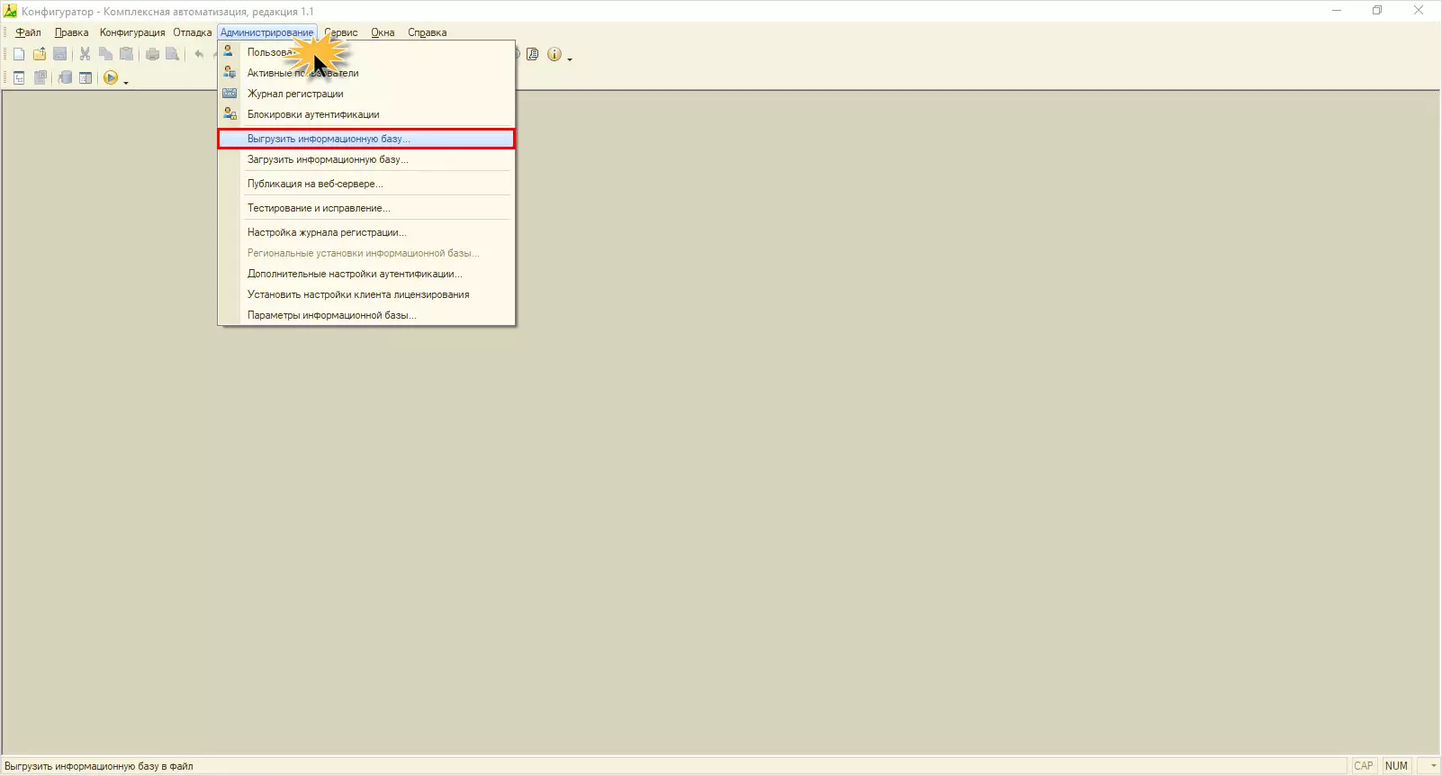 Шаг 1. Выполните резервное копирование информационной базы. Запустите 1С:КА 1.1 в режиме «Конфигуратор». В меню «Администрирование» выберите команду «Выгрузить информационную базу» и сохраните файл в папку с архивными копиями.