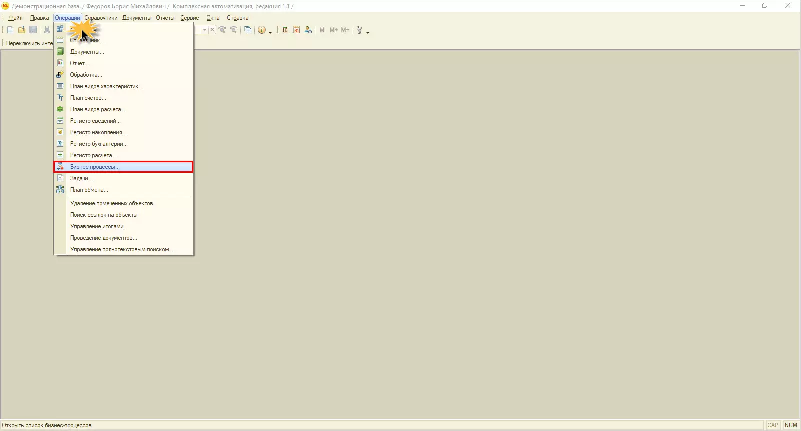 Шаг 8. Откройте блок регламентных операций, находящийся в пункте Бизнес-процессы, меню Операции.