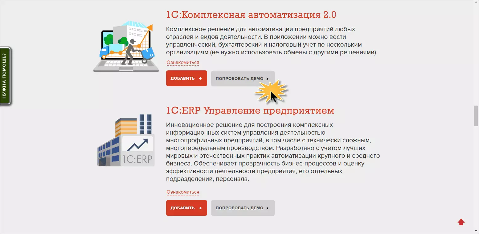 Функция «Попробовать ДЕМО» доступна для всех конфигураций, в т.ч. и 1С:Комплексная автоматизация 2.0. Нажав на эту кнопку, сформируется демобаза для ознакомления.