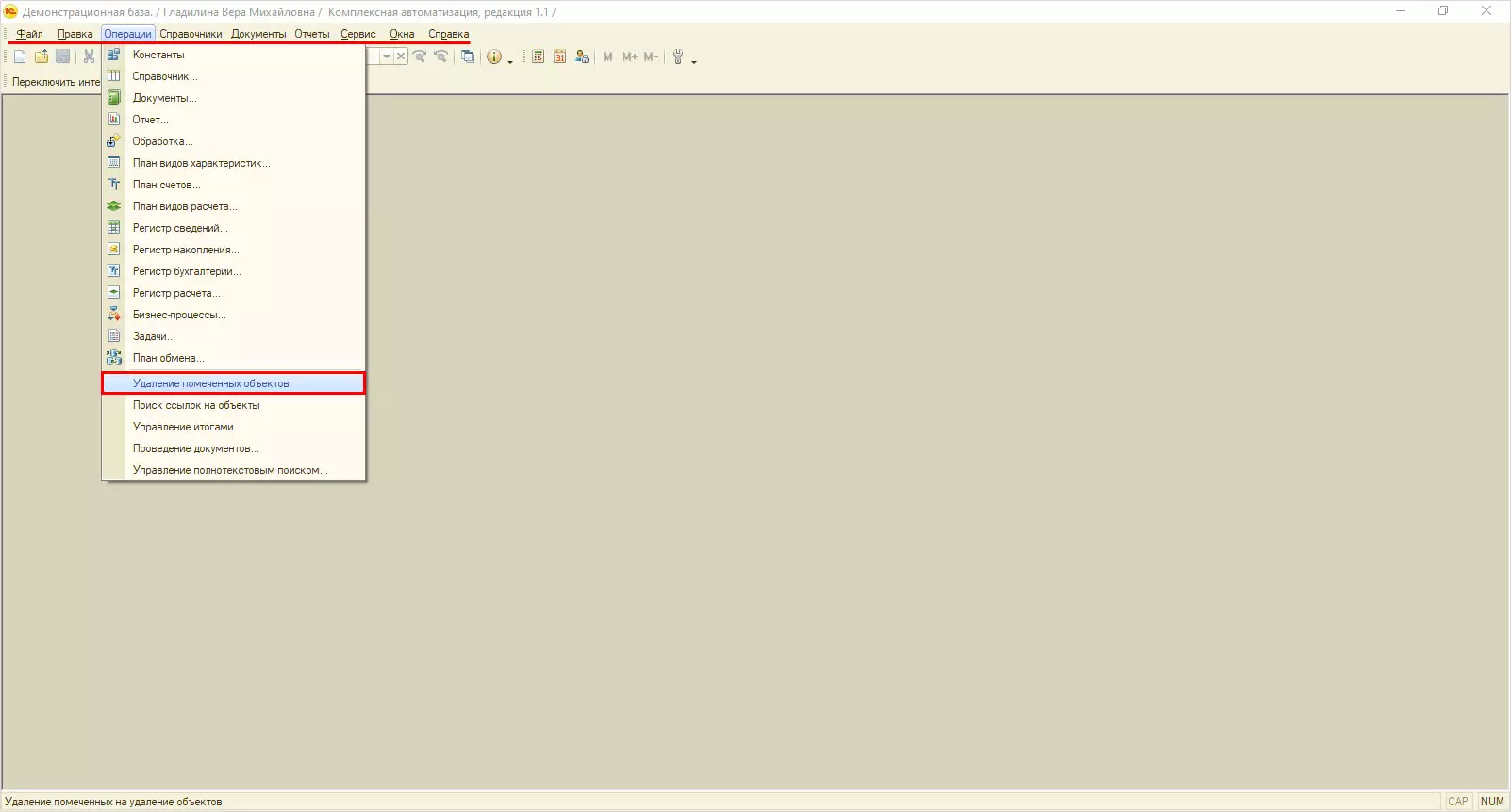 Шаг 4. Для очистки базы от лишнего «мусора» выполните удаление помеченных объектов – раздел Операции – Удаление помеченных объектов.