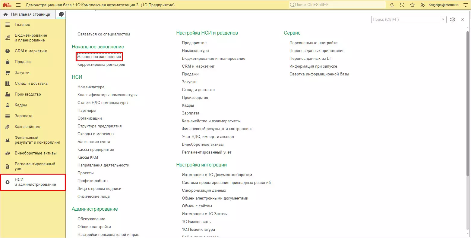 Шаг 2. Загрузите полученный путем выгрузки файл в разделе НСИ и администрирование – Начальное заполнение, Комплексная автоматизация, редакция 2.5.