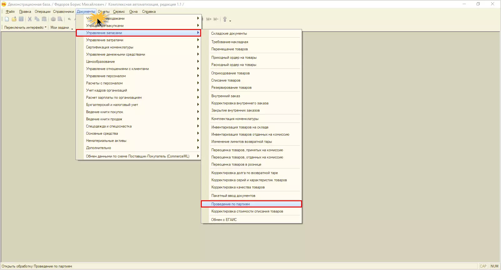 Шаг 7. При ведении учета по партиям выполните операцию – Документы – Управление запасами – Проведение по партиям.