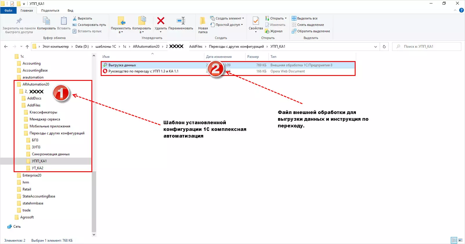 В папке установленного шаблона конфигурации находится файл внешней обработки для выгрузки данных и перехода других конфигураций. Находится он в папке - 2_5_ХХ_ХХХ\AddFiles\Переходы с других конфигураций\УПП_КА1.