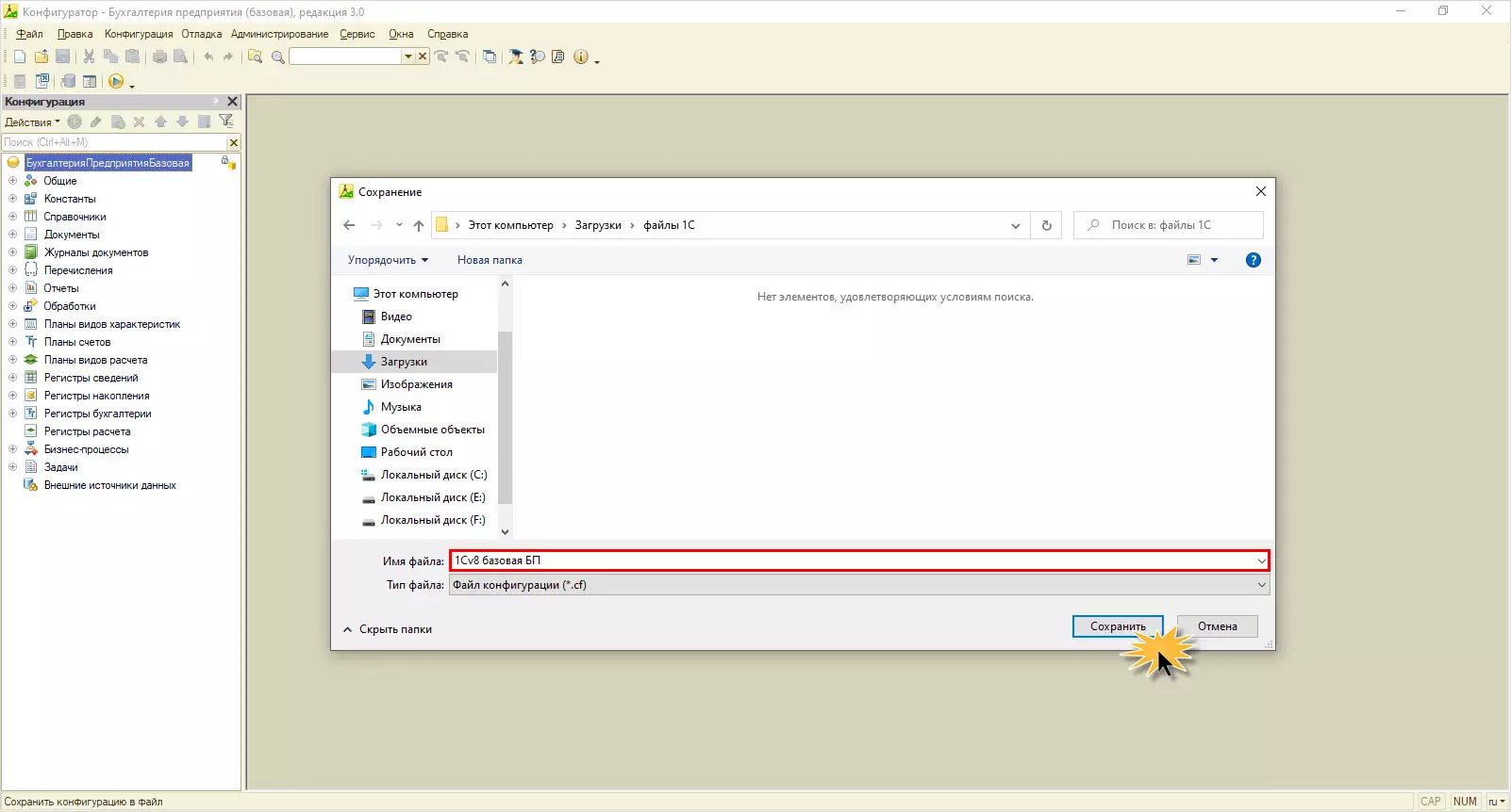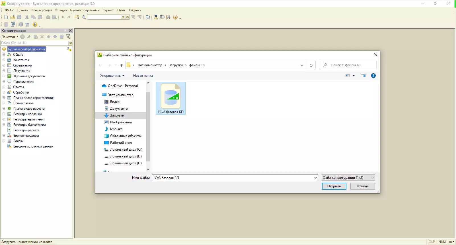 Шаг 5. В открывшемся окне выберите ранее сохраненный файл конфигурации «1С базовая БП.сf».