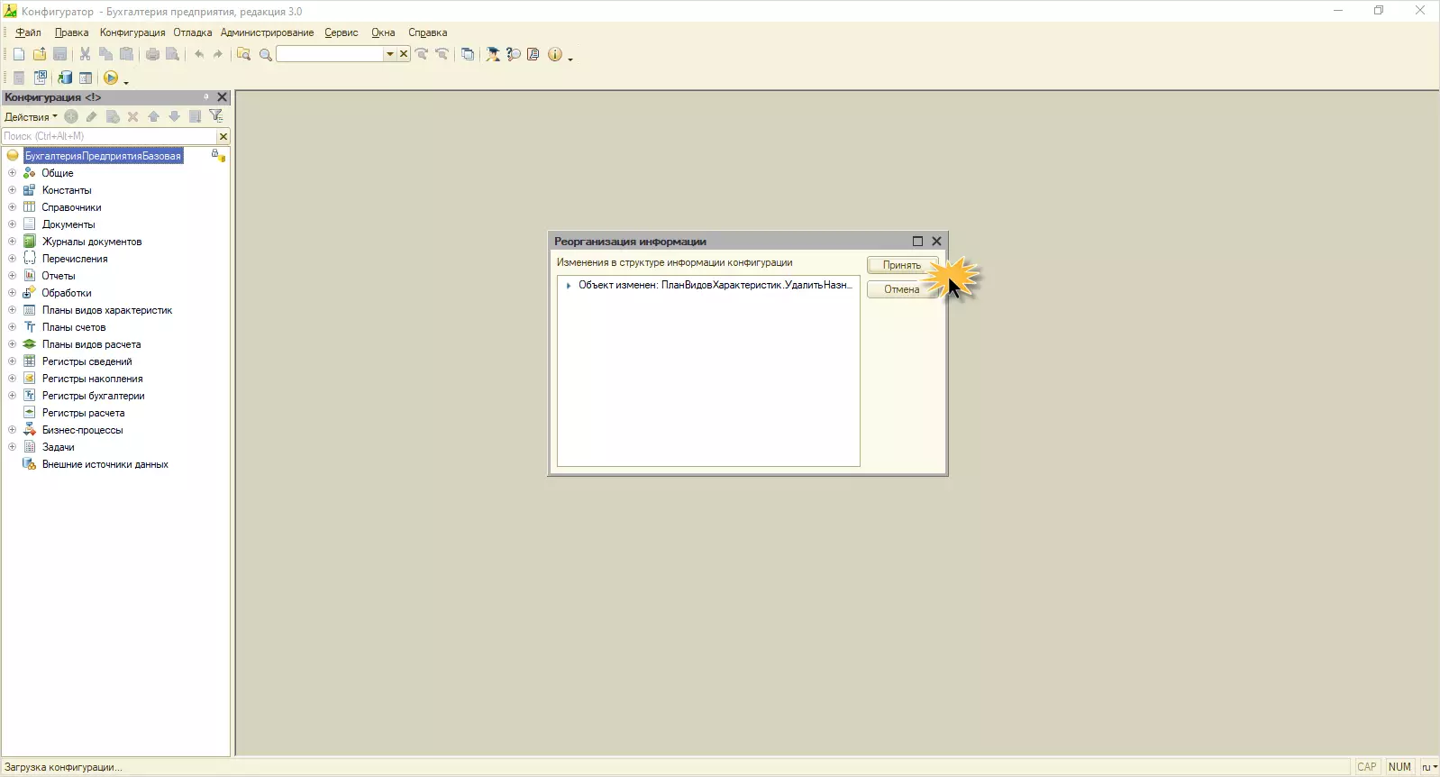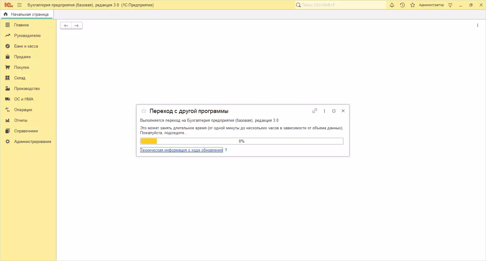 Запустив программу в режиме 1С:Предприятие, дождитесь окончания процесса перехода на базовую версию.