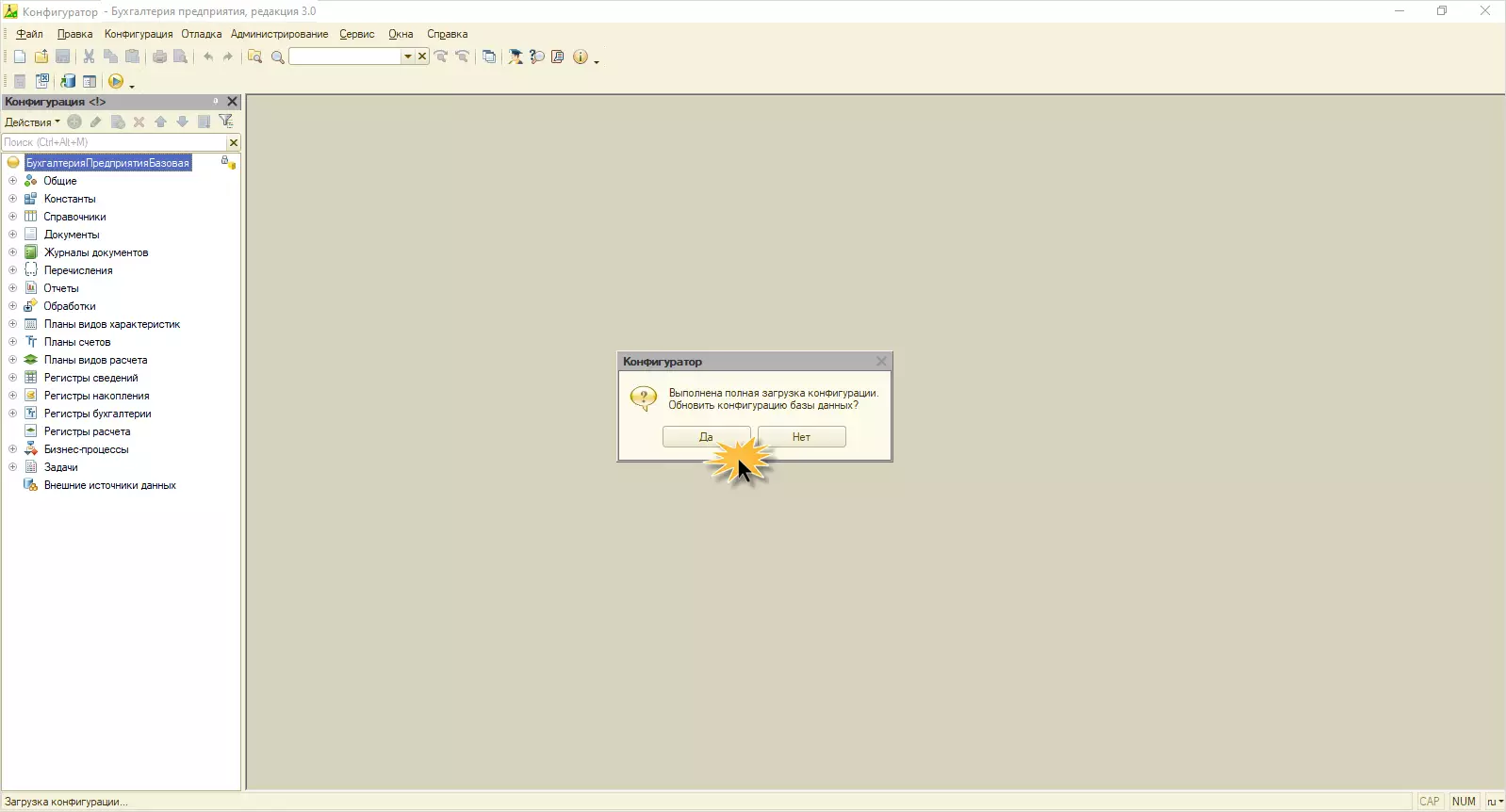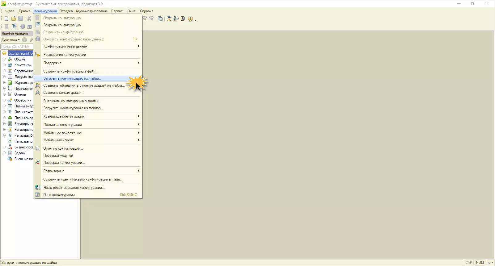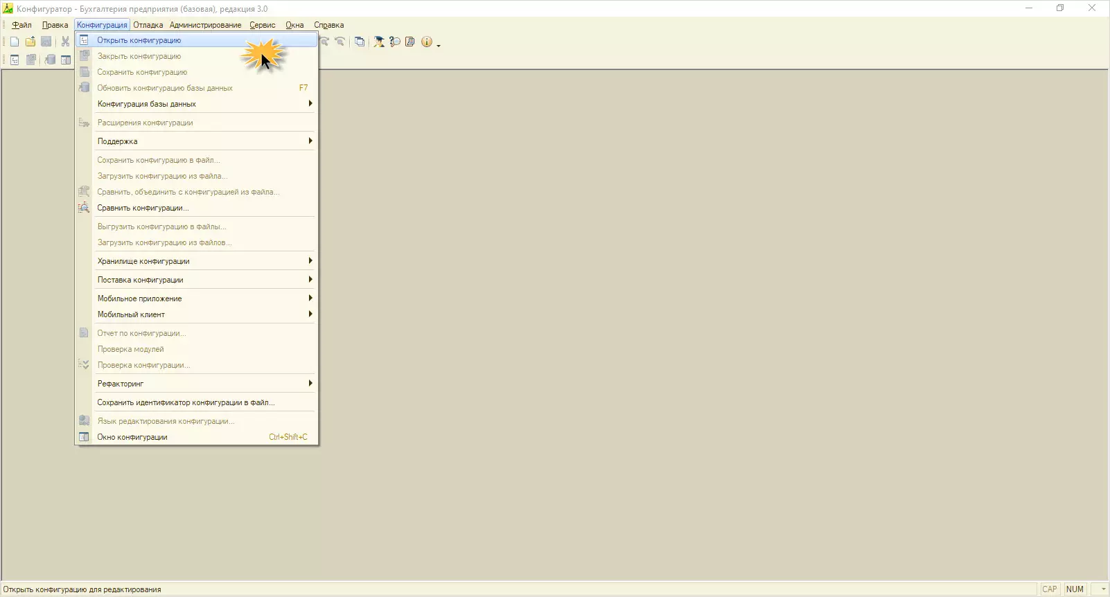 Шаг 1. Запустите установленную базовую программу в режиме конфигуратор и в меню «Конфигурация» выберите команду «Открыть конфигурацию».