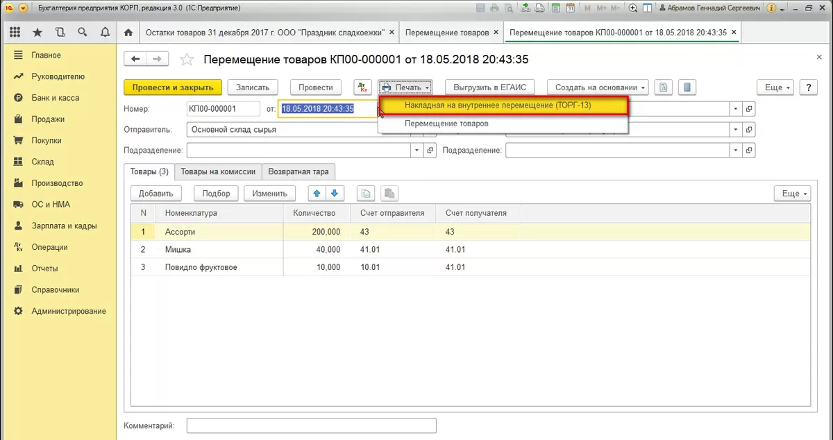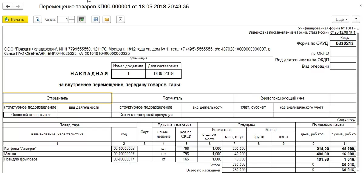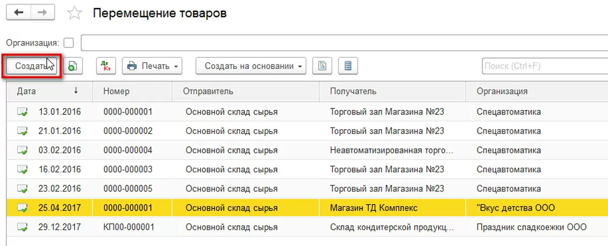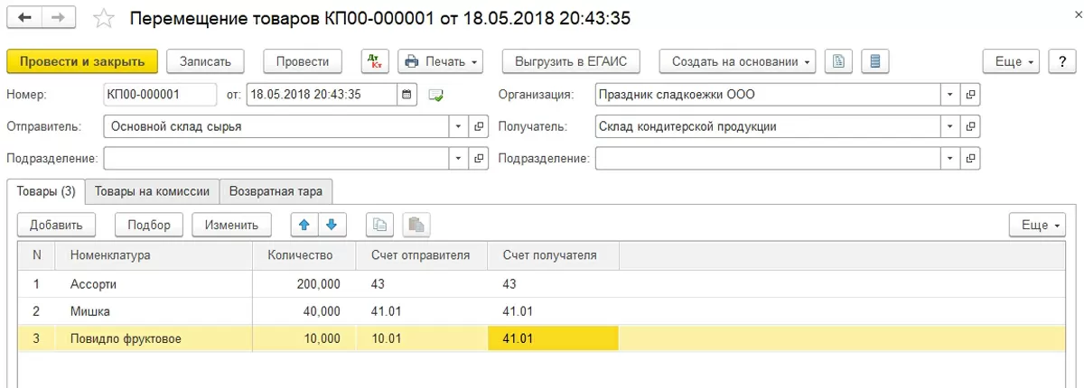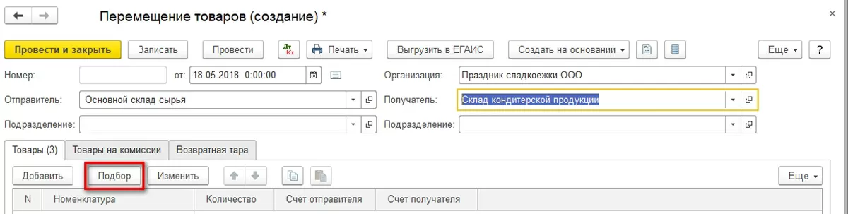 Необходимо переместить некоторые товары с основного склада сырья на склад кондитерской продукции. Таким образом, склад-отправитель – это основной склад сырья, а склад-получатель – склад кондитерской продукции. Следуем далее по нашему плану.