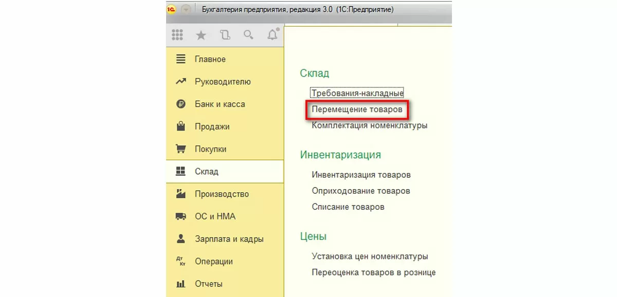 Рассмотрим подробно, как сделать перемещение товаров в 1С:Бухгалтерии 8.3.