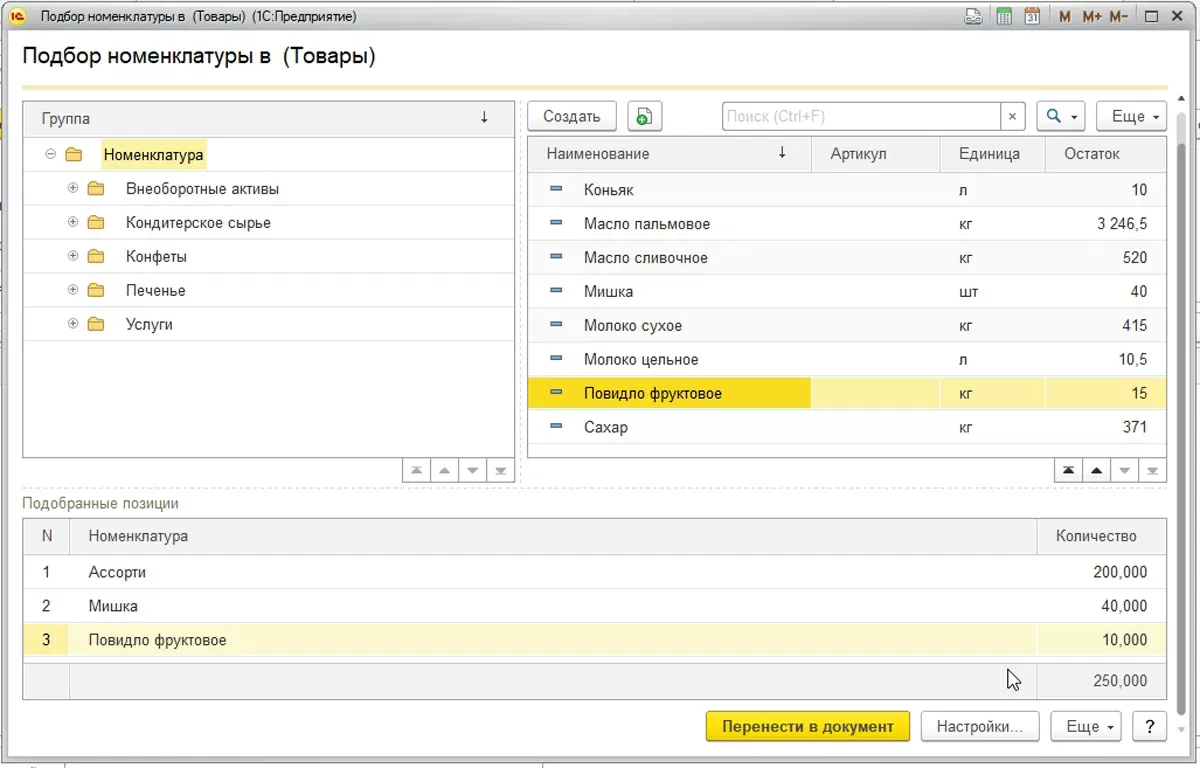 После нажатия кнопки «Подбор» в открывшемся окне имеем перечень номенклатуры по остаткам склада-отправителя, выбираем нужные нам для перемещения позиции и указываем перемещаемое количество. Подобранные товары предварительно попадают в нижнюю часть окна подбора, а затем одновременно могут быть перенесены в документ по кнопке «Перенести в документ».