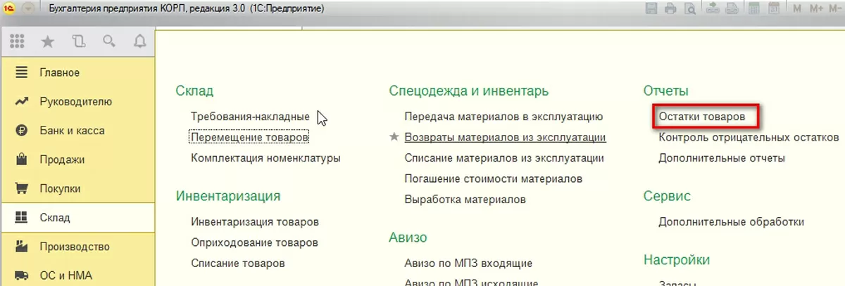 Формируем отчет «Остатки товаров», который доступен через полный интерфейс, раздел «Склад»–«Отчеты».
